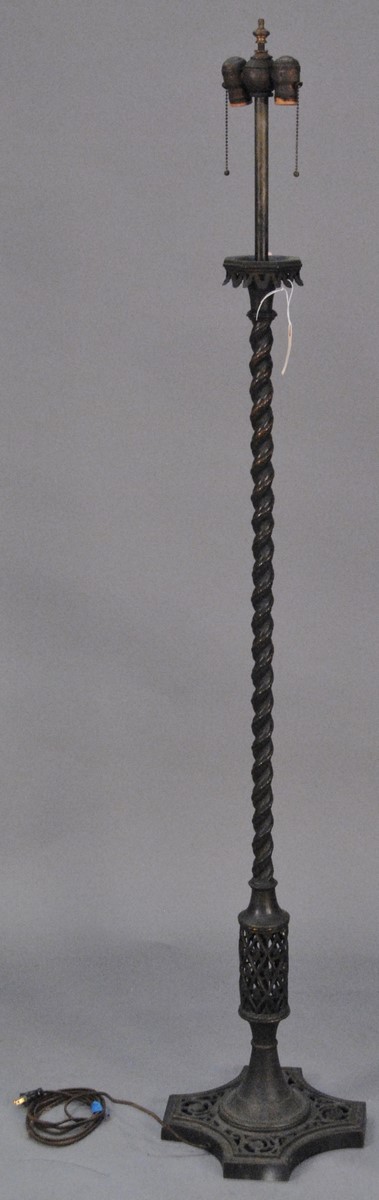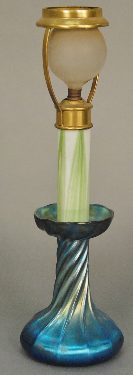 Tiffany blue Favrile glass candlestick lamp with spiral ribbed blue base having columnar opaque white glass standard with upright green leaves, marked on base LCT drill hole on side with no wire and no shade. vase ht. 5 1/4 in. total ht. 12 1/4 in.