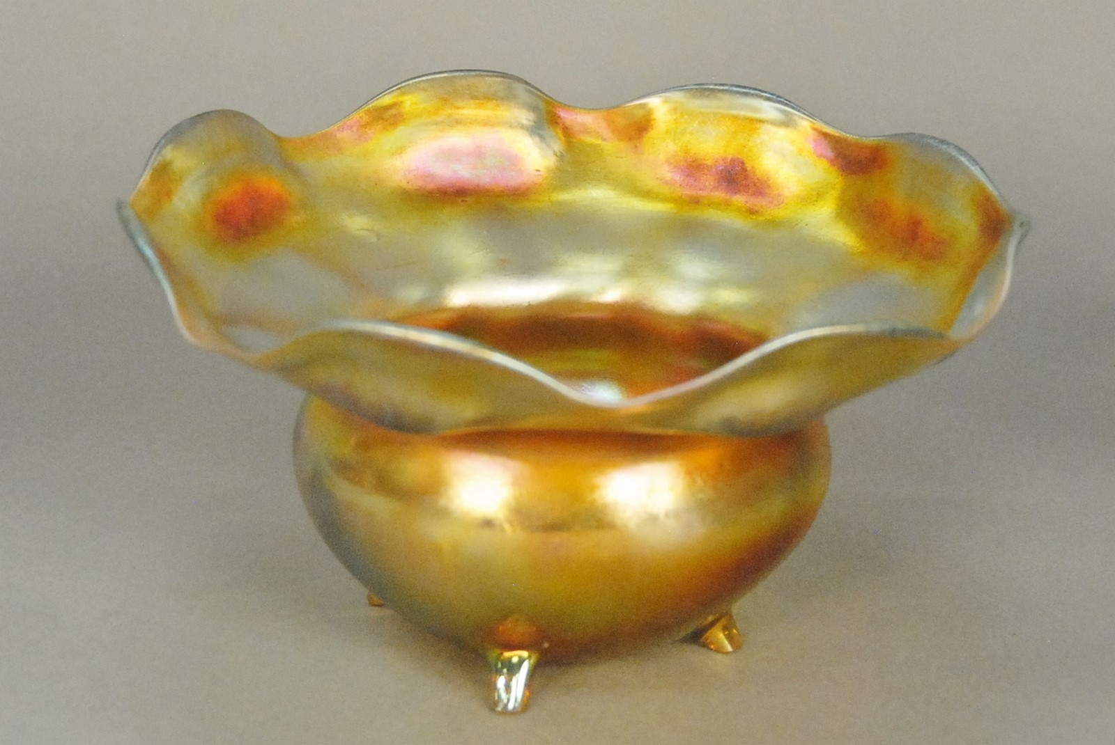 Tiffany Favrile gold iridescent footed bowl having a ruffle flared rim set on four feet, inscribed on bottom L.C. Tiffany Favrile 486C, also with original paper label small chip on one foot. ht. 4 1/4 in.