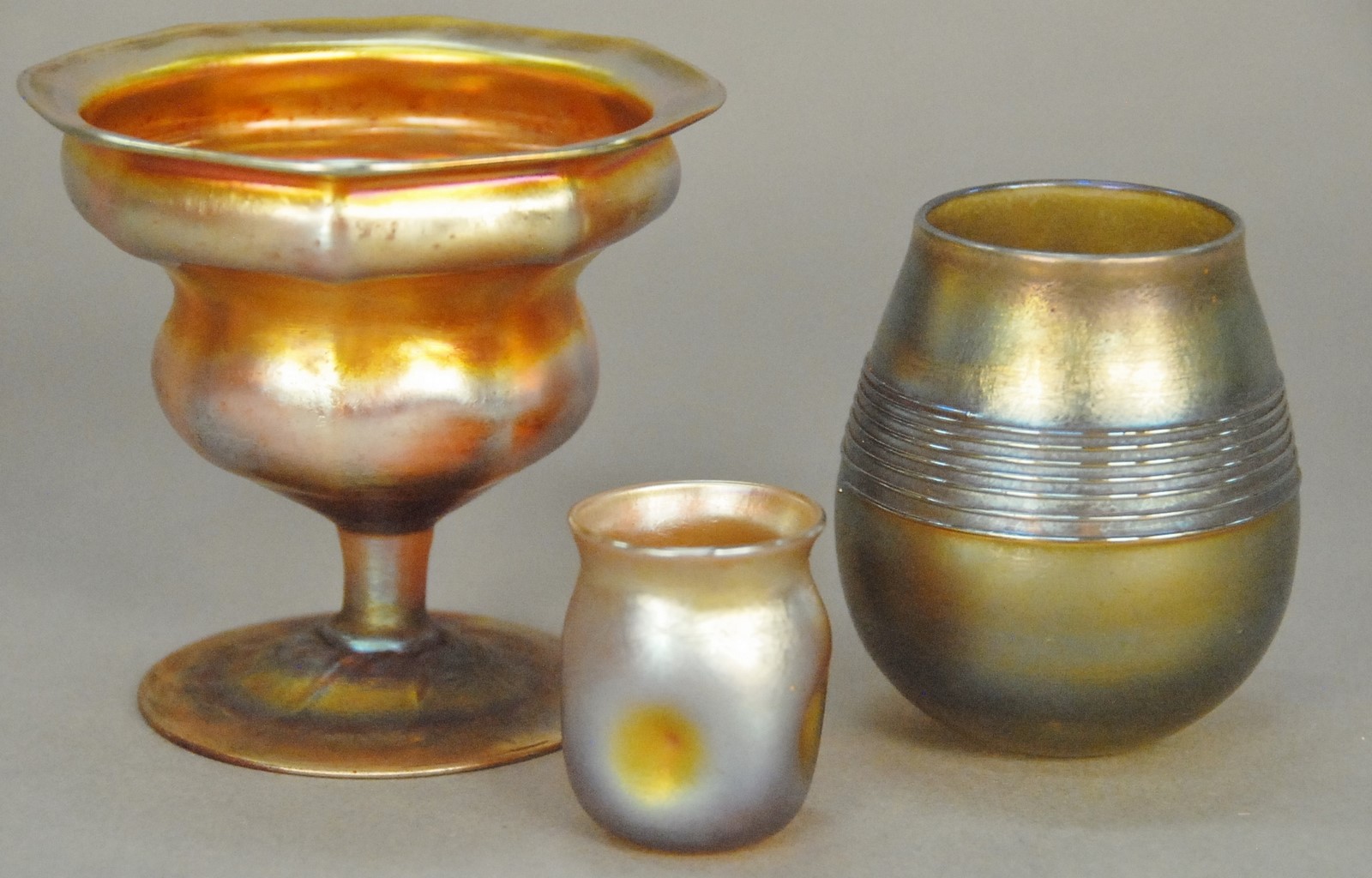 Three piece lot Tiffany gold Favrile to include one glass compote inscribed L.C.T. 4001B, a toothpick holder inscribed L.C.T., and a barrel form vase with applied thread design numbered 05259, not signed. compote: ht. 3 3/4 in. toothpick holder: ht. 1 7/8 in. vase: ht. 3 1/4 in.