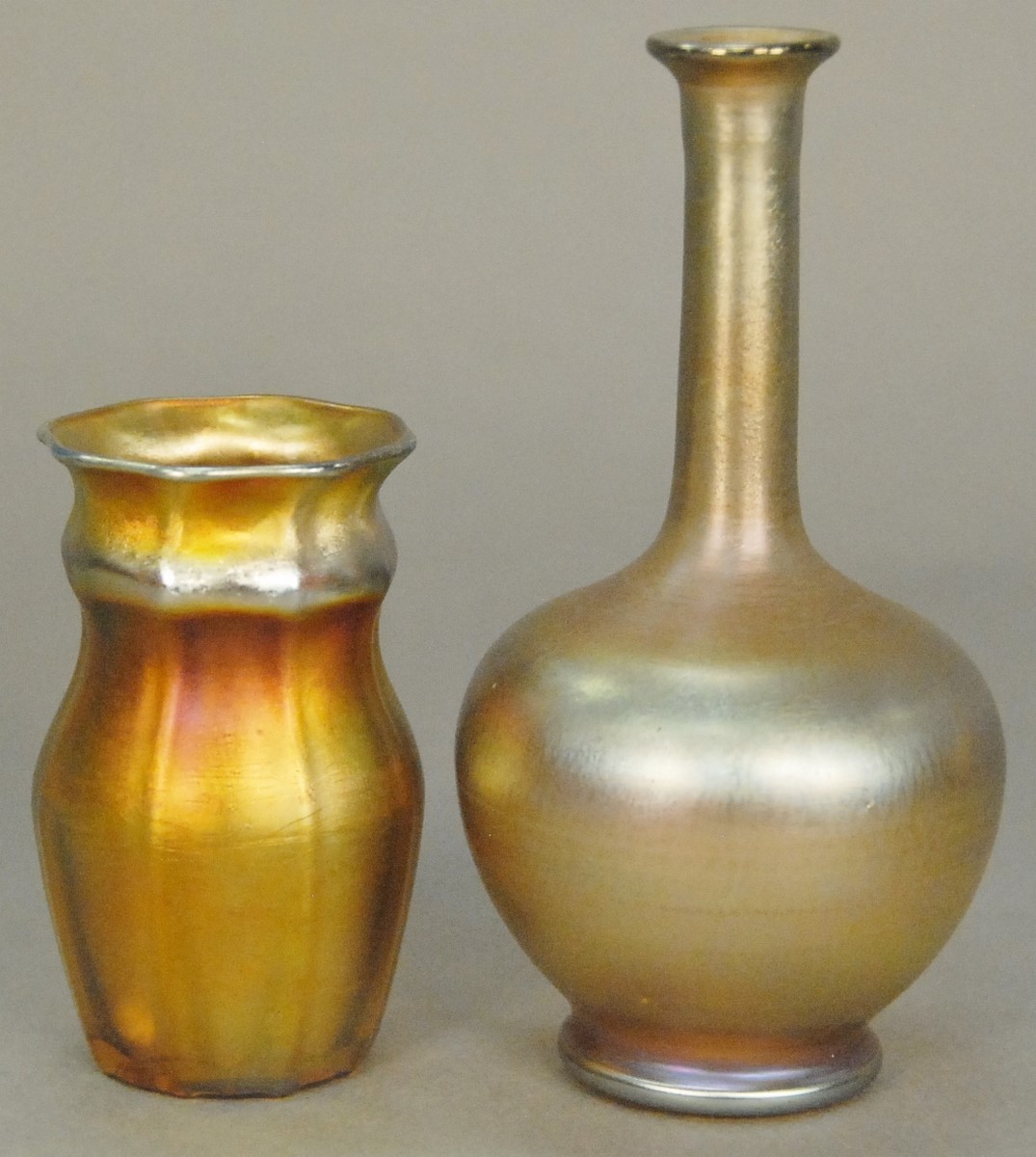 Two Tiffany gold Favrile glass cabinet vases, one with ruffled top and ribbed body inscribed L .C. Tiffany Favrile 8292H and one with flared top, plain stem and bulbous body on round base inscribed L.C. Tiffany Favrile 1126-6879M. ht. 3 3/4 in. & ht. 5 3/4 in.