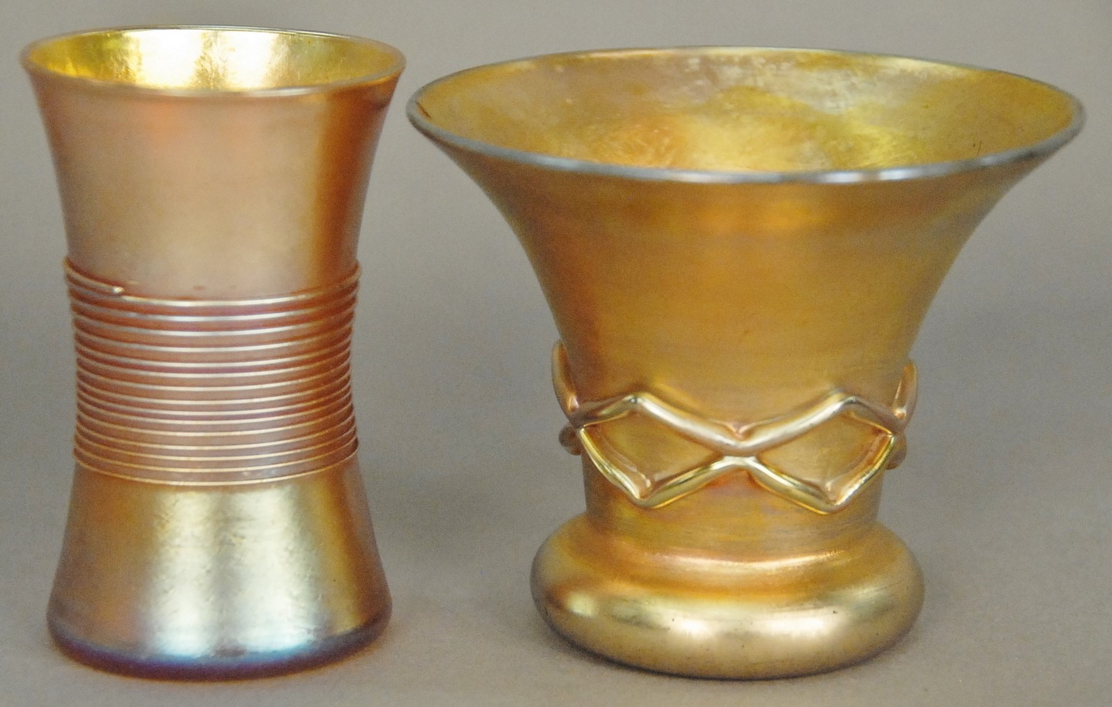 Two piece Tiffany gold iridescent Favrile glass lot to include a tumbler with flared rim and applied thread inscribed on bottom L.C.T. and a vase having flared rim and applied lattice on waist inscribed on base L.C. Tiffany Favrile 7008E. tumbler: ht. 4 in. vase: ht. 3 3/4 in. dia. 4 1/2 in.