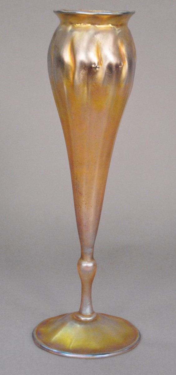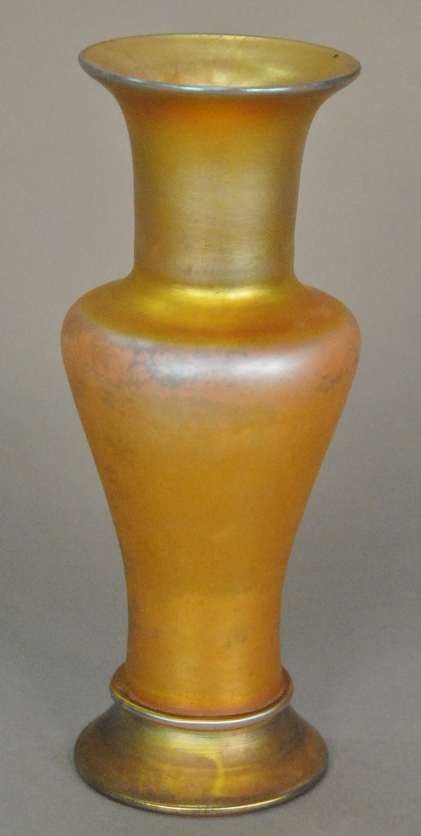 Tiffany gold iridescent Favrile glass vase with flared rim, cylindrical neck, and tapering body, set on circular footed base, marked L.C. Tiffany Inc. Favrile 1550-3454N. ht. 9 3/4 in.