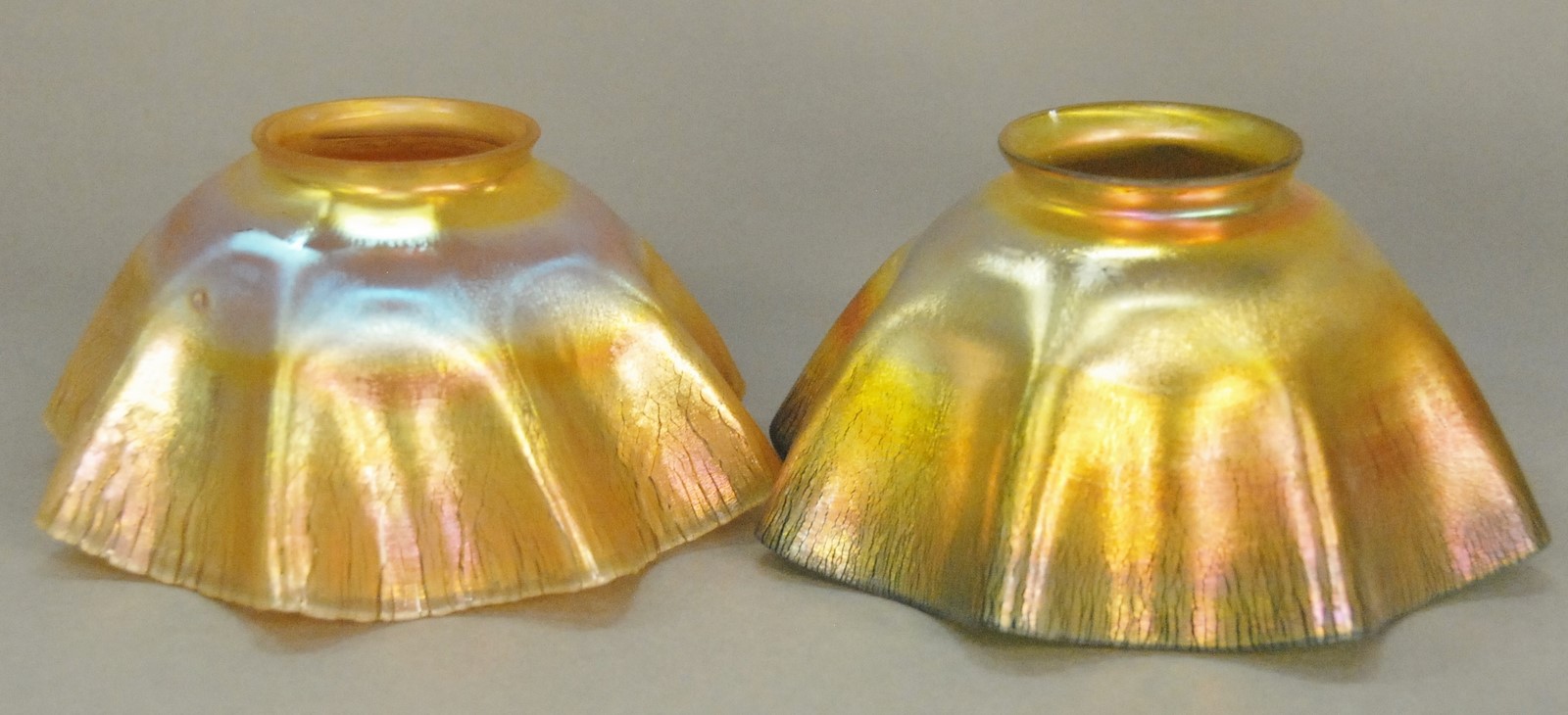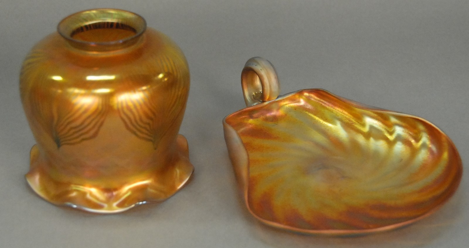 Two piece lot to include Steuben Aurene gold iridescent dish with applied handle having original paper label Steuben Glass Works Corning N.Y. and a shade with ruffled top and pulled feather design marked with silver Steuben shield. dish: lg. 7 1/4 in.
