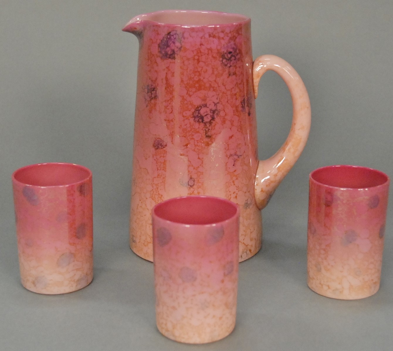 Agate glass pitcher with three tumblers, New England Glass Company Cambridge Mass, circa 1899, rose to pink with mottled blue staining. pitcher: ht. 8 1/2 in. tumbler: ht. 3 3/4 in.