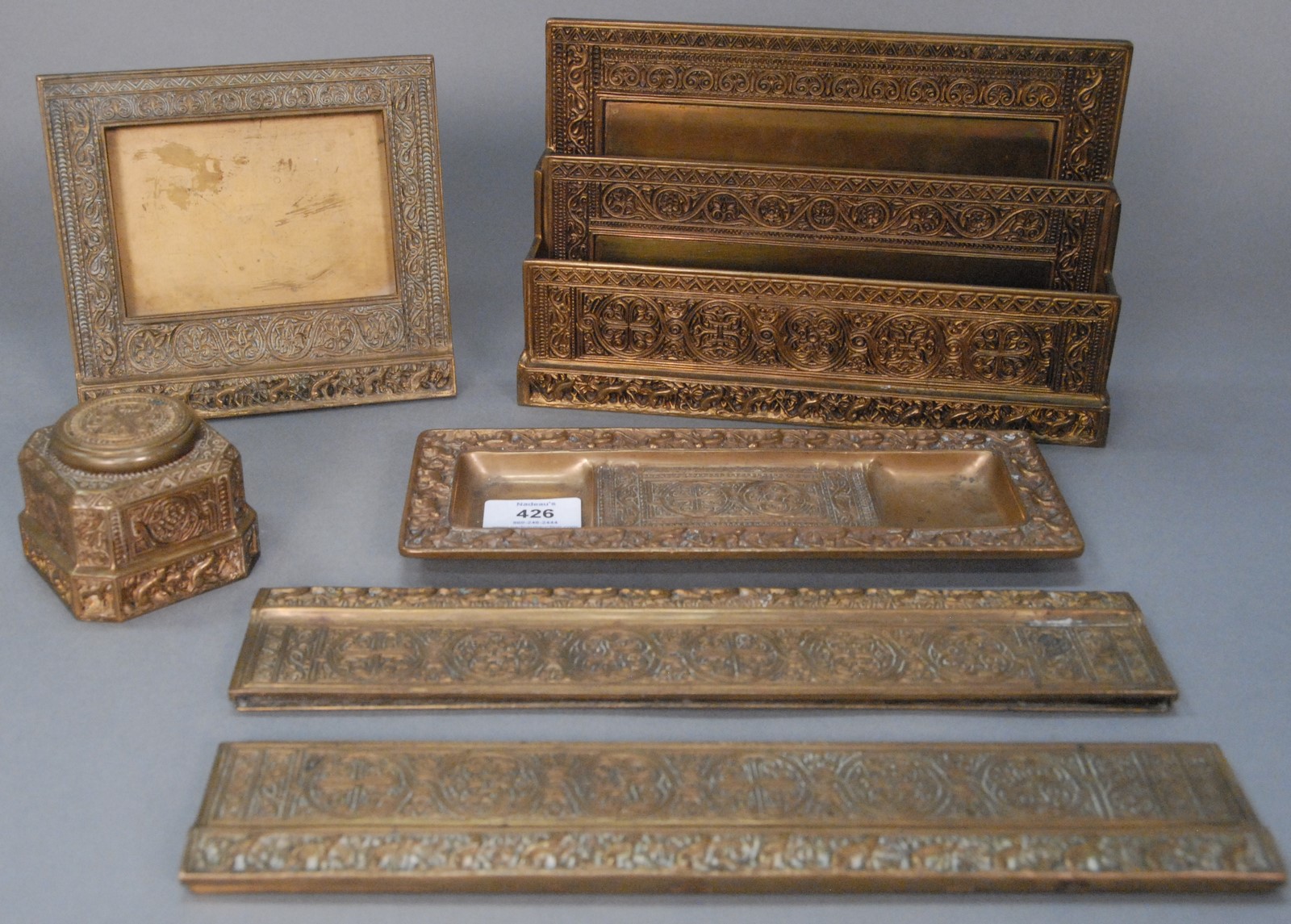 Tiffany Studios venetian bronze desk set to include letter rack #1644, pen tray #1642, blotter ends #1640, inkwell #1700, and calendar holder/frame #1648, all marked Tiffany Studios and numbered.