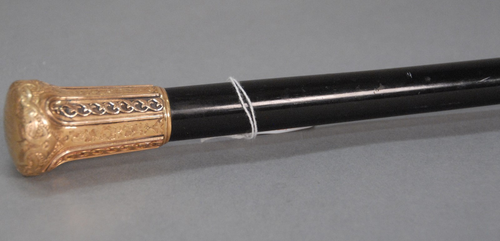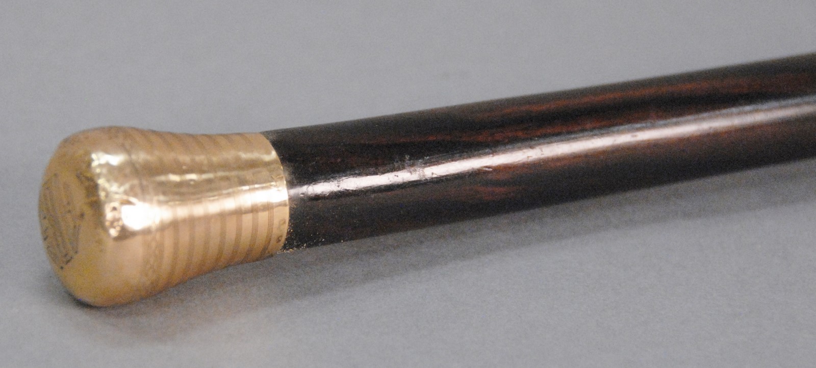 Gold top cane marked on top Presented to F. H. Oliphant on retiring from business as a token of respect and gratitude by the employees of Fairchance Iron Works, Jan. 19, 1870.