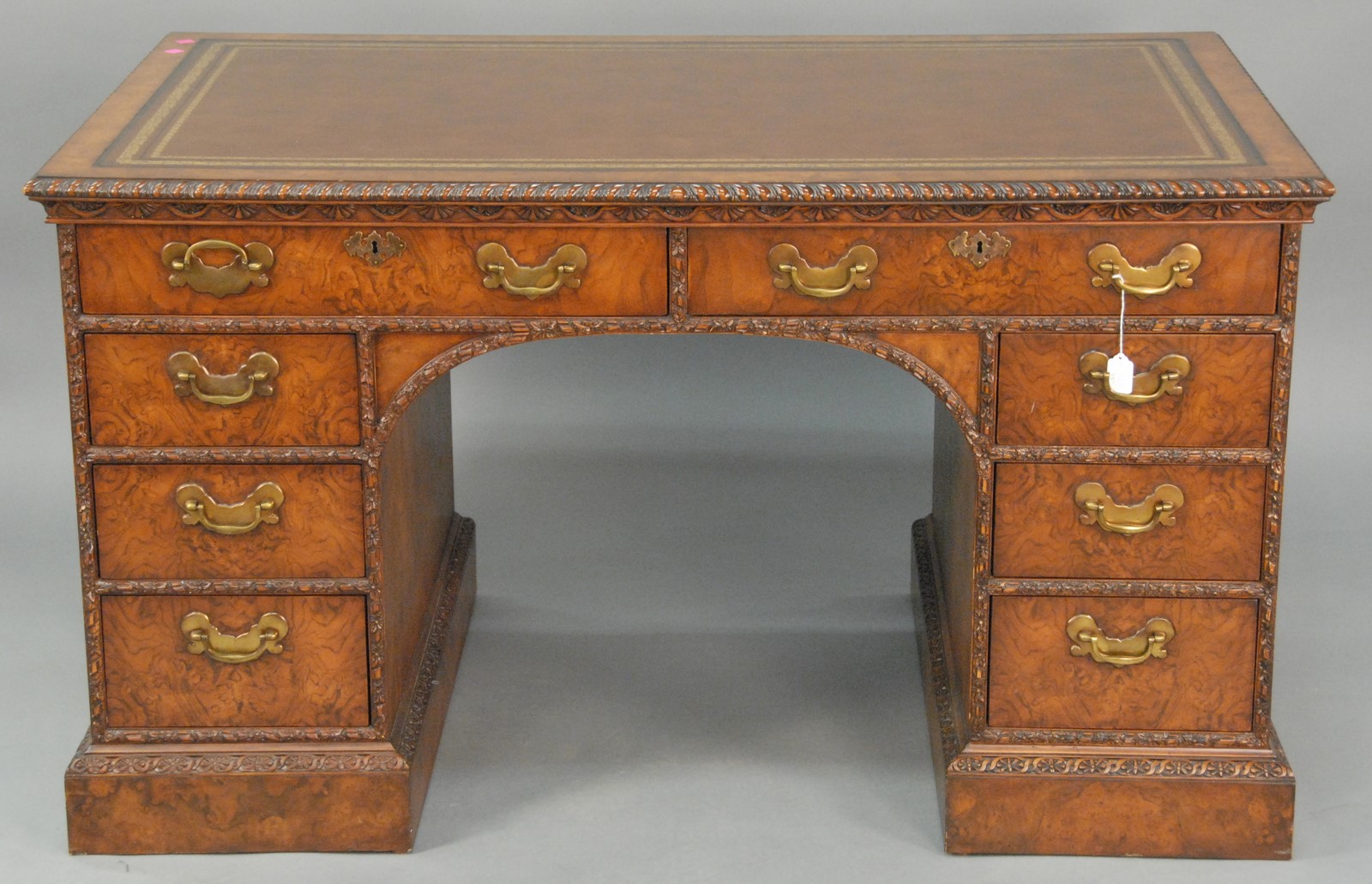 Burlwood kneehole desk having leather top gadrooned edge, two large drawers over three short drawers, sides and back paneled and carved, all set on plain base with carved edge, late 20th century. ht. 31 in. wd. 52 1/2 in. dp. 39 in.