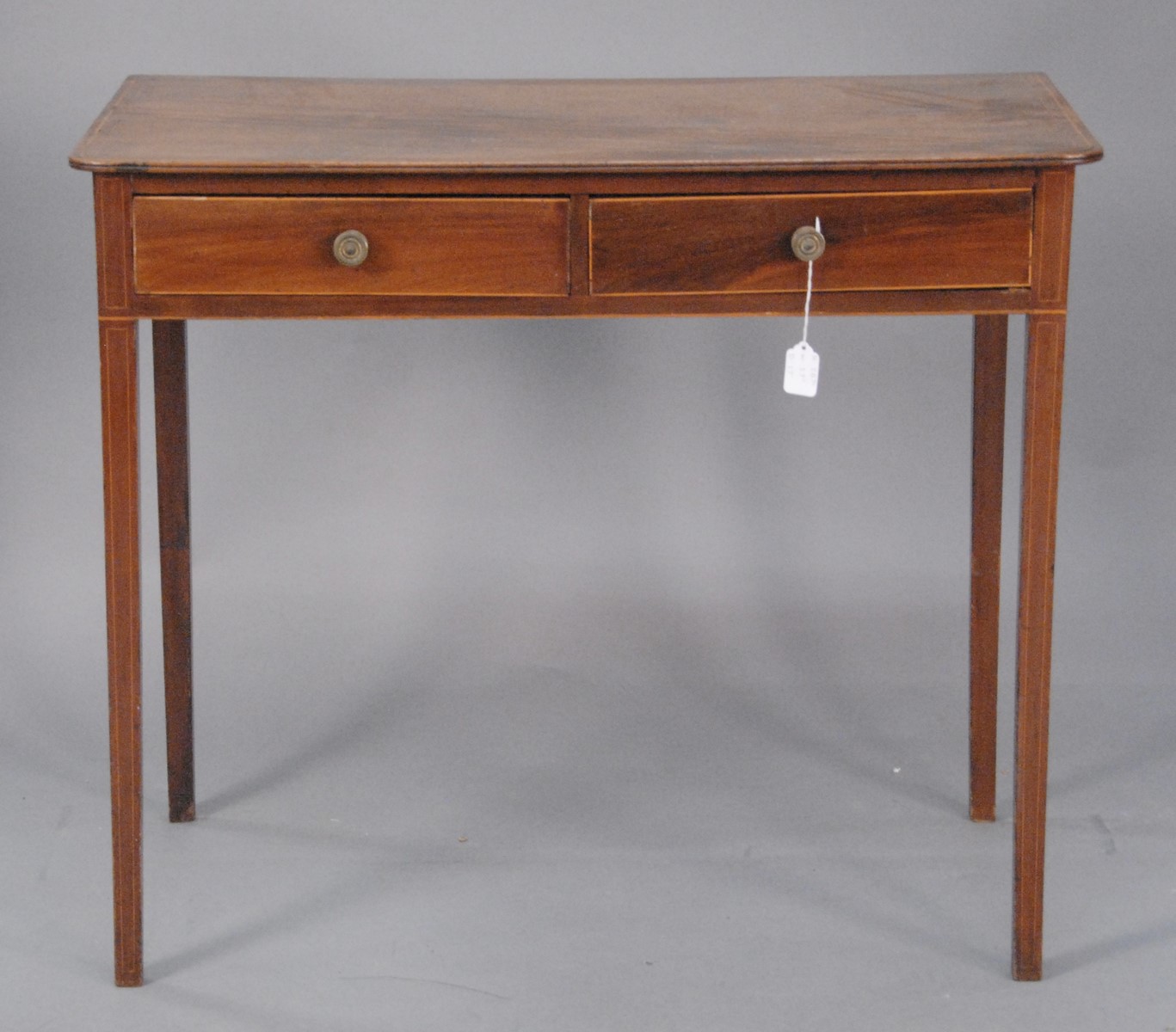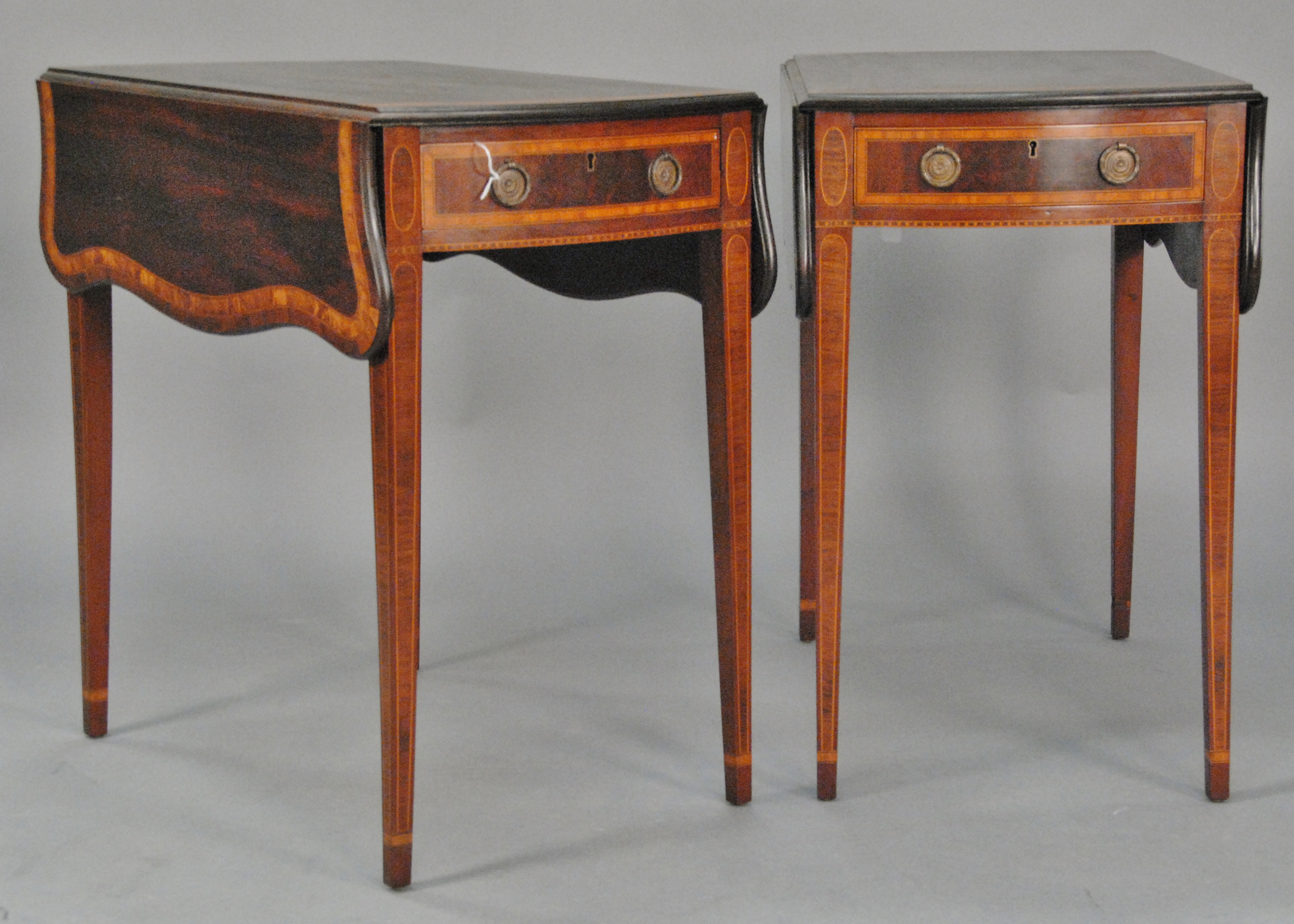 Pair of Benjamin Ferber custom mahogany Pembroke drop leaf tables with banded inlaid top, shaped leaves, all set on square tapered panel inlaid legs, 20th century. ht. 27 in.