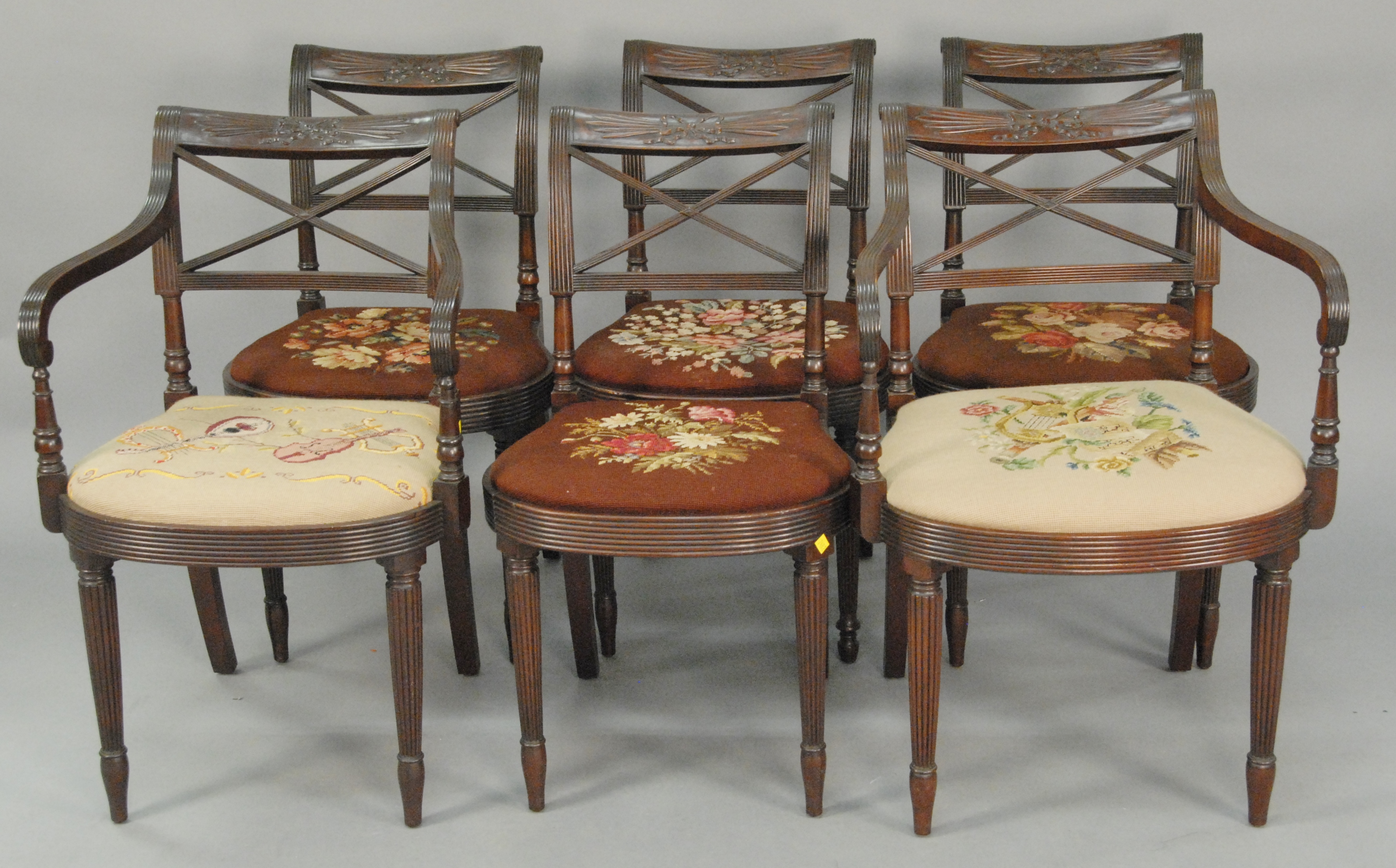 Set of six Sheraton style custom mahogany dining chairs with needlepoint slip seats and carved backs set on turned and fluted legs, attributed to Benjamin Ferber.