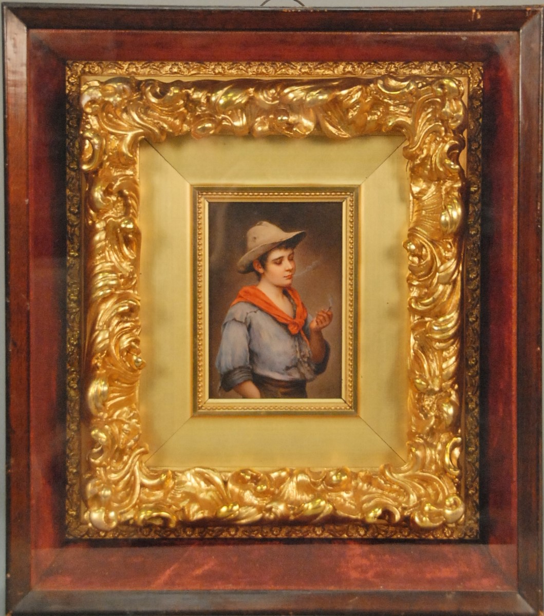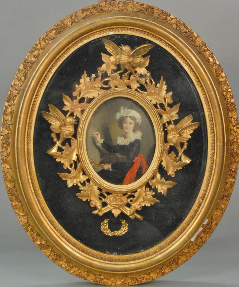 After Elisabeth Vigee Le Brun 1755-1842 MADAME LE BRUN portrait of herself oil on board unsigned marked on verso Mme Le Brun painting size: 8 1/2 x 6 1/2 shadow box size: 26 x 22