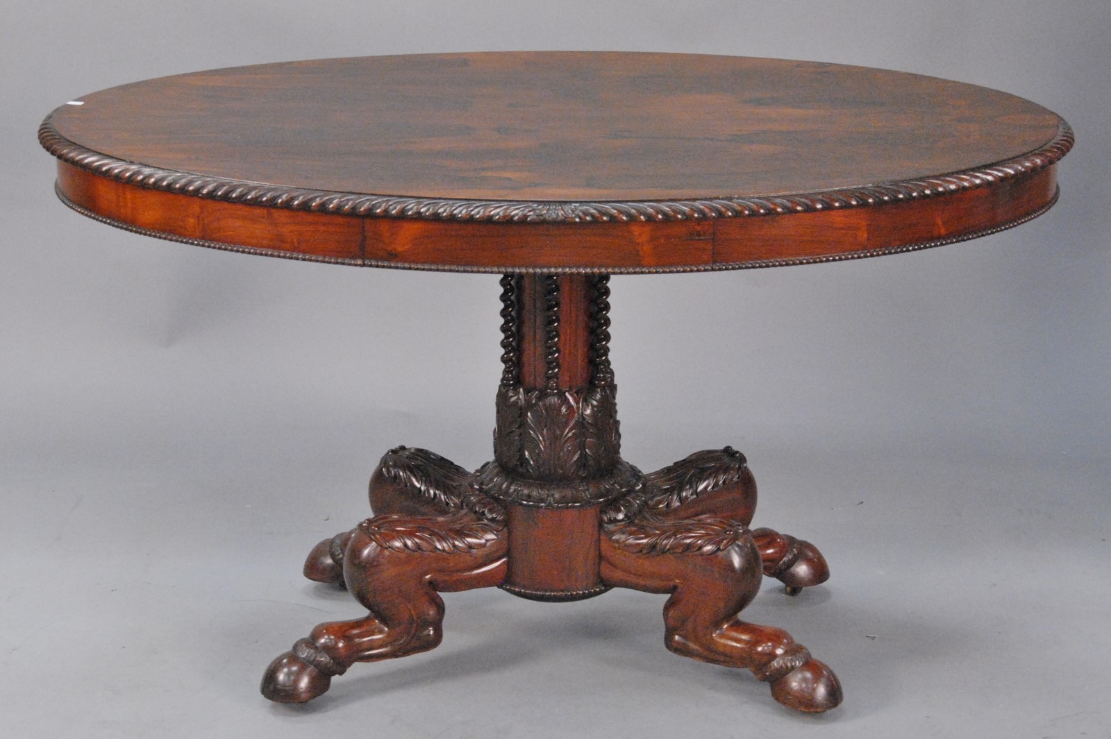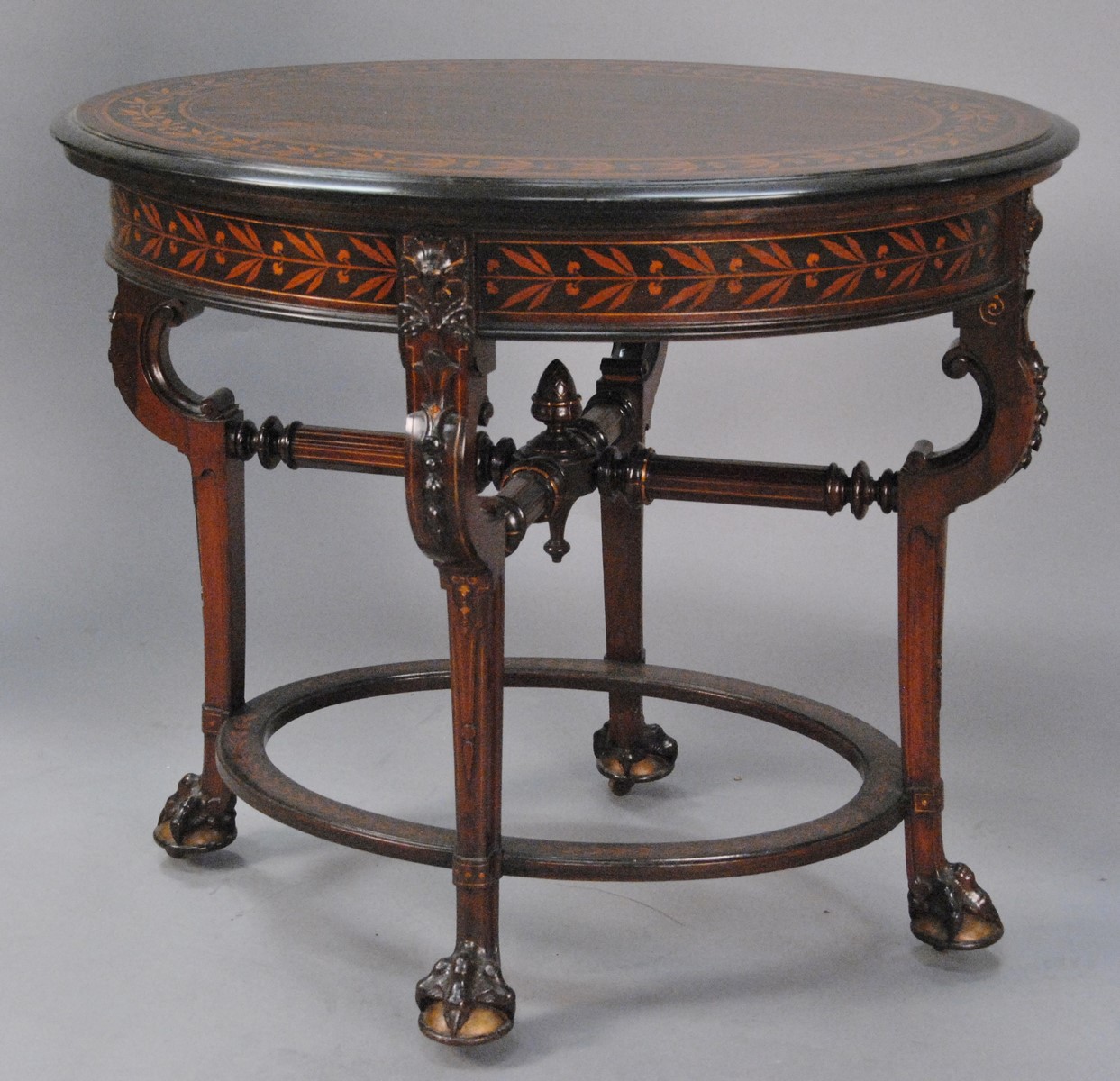 Herter Brothers rosewood center table, oval top with leaf and berry inlay over conforming inlaid skirt on four legs, tops with shell carving over carved bellflowers over braceleted ankles with claw feet on half round ball feet, oval flat stretcher inlaid with conforming leaf and berry, signed under top Herter Bros. ht. 30 1/2 in. top: 29 x 36