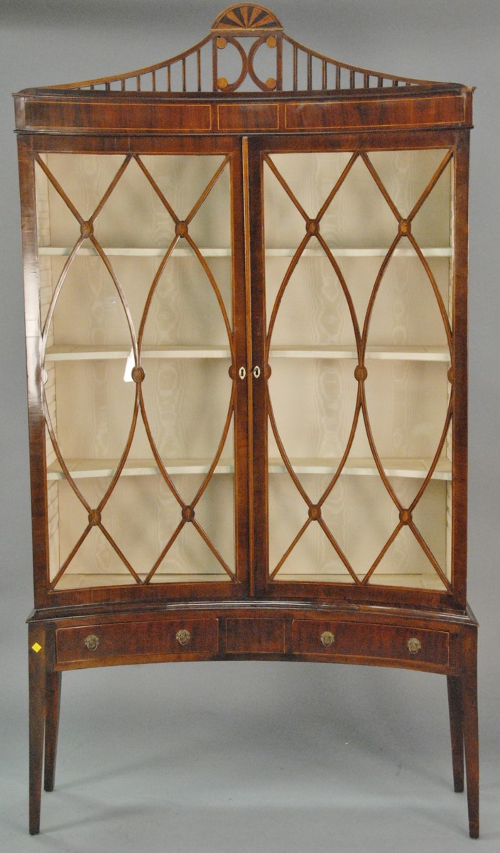 George IV mahogany china cabinet having inlaid pierce carved pediment top over two concave glazed doors set on base with two drawers on square tapered legs, base is made up, interior has adjustable shelves and cloth lined. ht. 84 in. wd. 44 in. dp. 13 in.