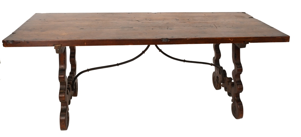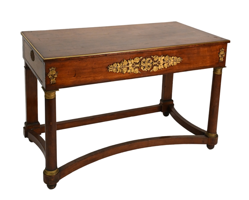 Cherry Console Table, in the French Empire taste, having rectangle top with drawer on either end, set on round legs, joined by elliptical stretchers, top banded with brass, having foliate brass appliques on front, top and bottom of legs, 19th century, height 29 1/4 inches, top 23″ x 44 3/4″.