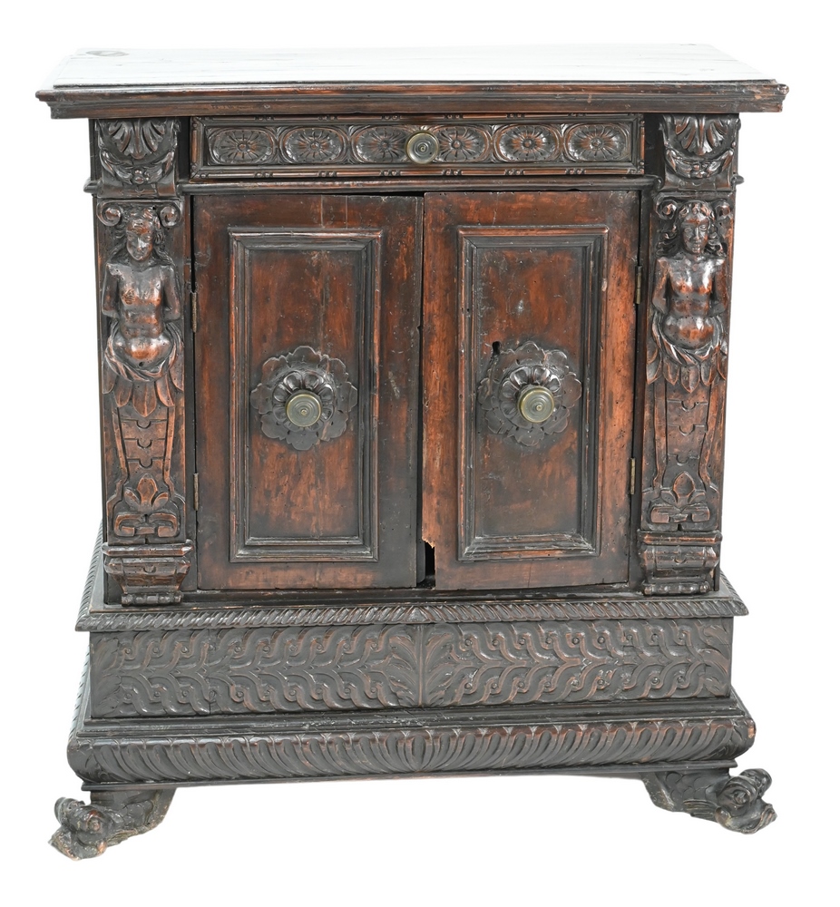 Italian Renaissance Credenza, having rectangular molded edge top above a frieze drawer carved with rosettes above two paneled doors with rosette and brass pulls, flanked by voluted and garland pilasters decorated with female terms over a leaf carved and gadroon banded plinth base on stylized dolphin feet, probably 17th – 18th century, height 37 inches, top 15 1/2″ x 34 1/2″