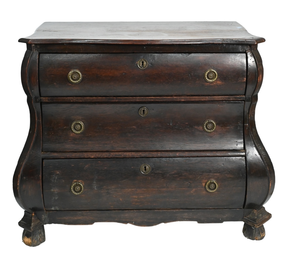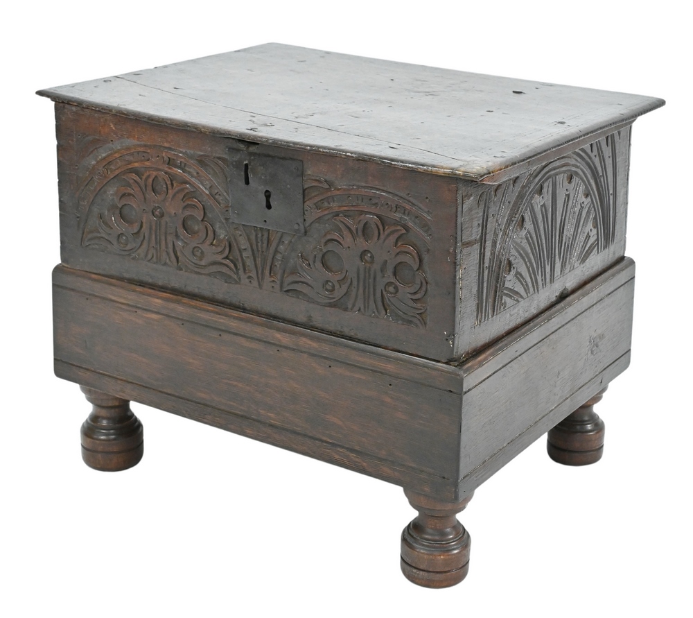 Stuart Carved Oak Bible Box, having rectangle lift lid above arch carved panels on three sides, now on stand with turned feet, 17th century, height 8 1/2 inches, total height with stand 17 1/2 inches, width 22 1/2 inches.