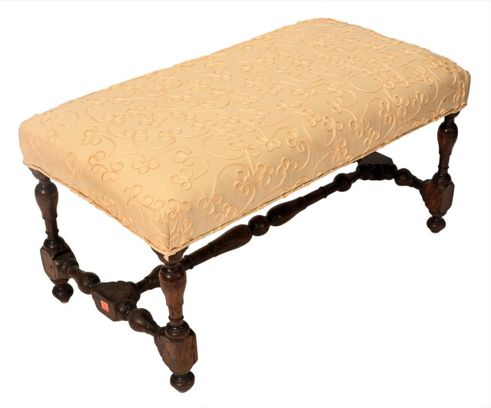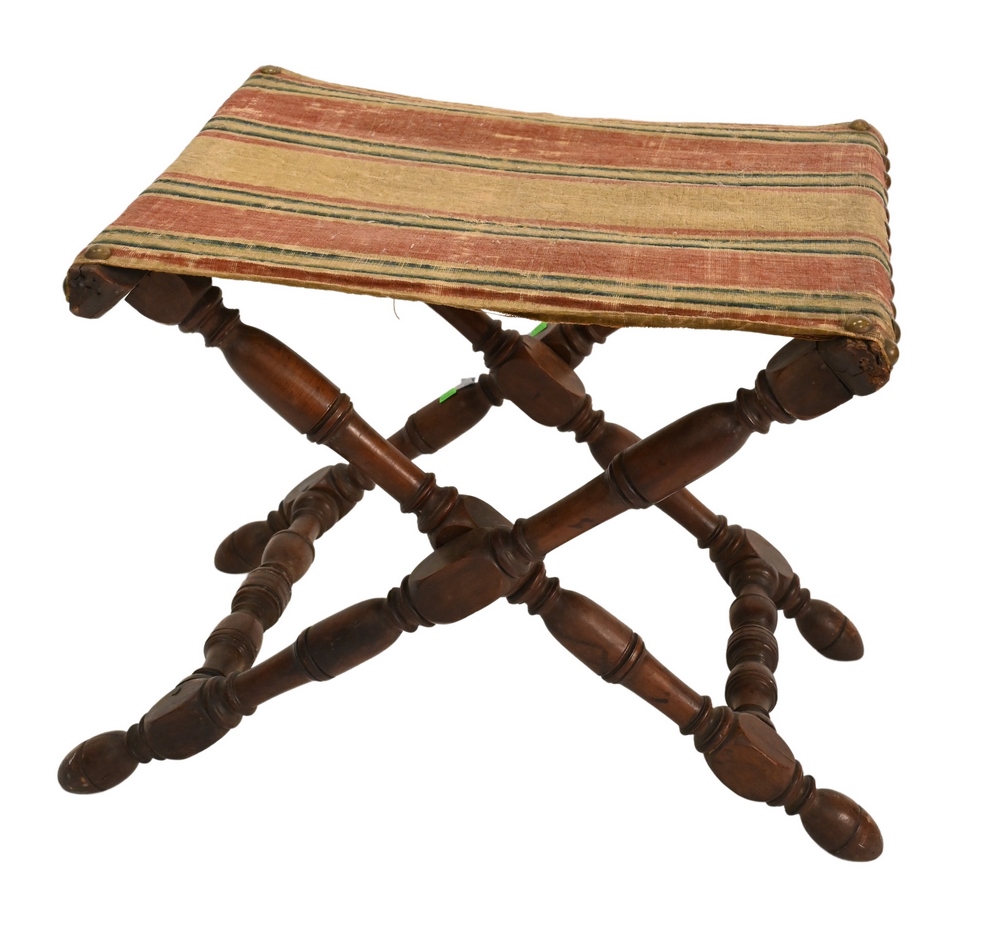 Continental Walnut Folding Stool, having block turned legs and stretchers, having large brass tacks on upholstery, 17th/18th century, height 19 1/2 inches, top 18″ x 23″.