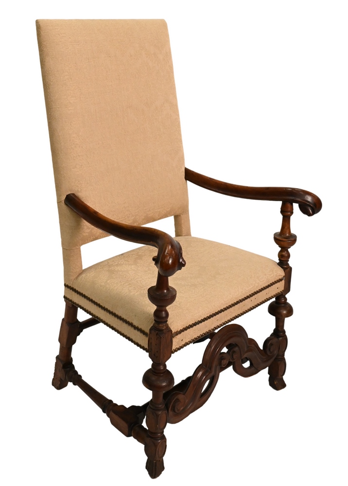 William and Mary Armchair, having upholstered back and seat on urn carved and turned legs ending in Spanish feet, with turned stretchers, and hand written paper, attributed to Adam Bonnet 1660 – 1714, height 45 inches, width 28 inches, seat height 17 inches.