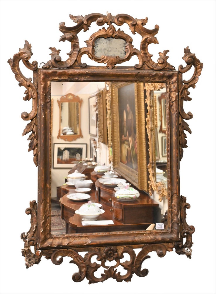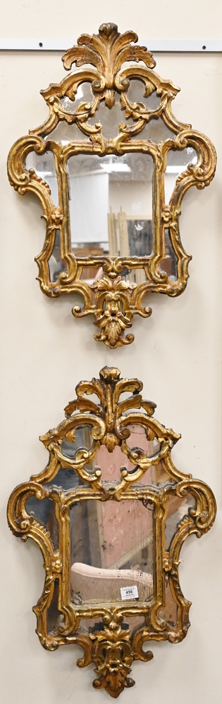 Pair of Italian Gilt Framed Mirrors, having frame over mirror, probably 18th century, height 29 inches, width 19 inches. Provenance: From a private New York City collection.