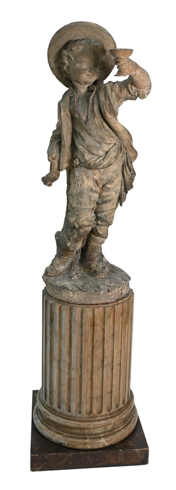 Terracotta Full Length Figure of a Boy in a Hat, having wine cup, standing on fluted wood pedestal, total height 71 inches. Provenance: Property from the Estate of Alexis Gregory, Sold to Benefit the Alexis Gregory Foundation.