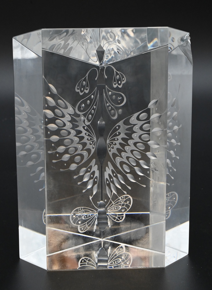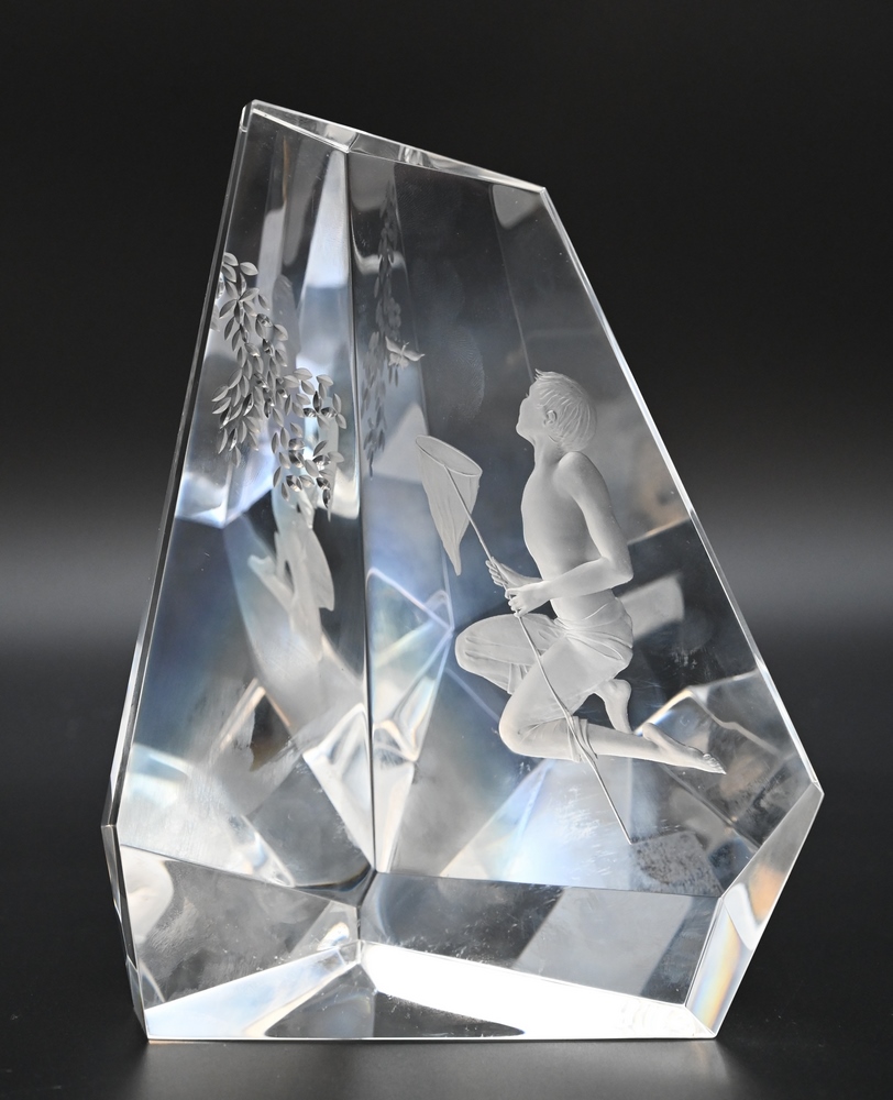 Steuben Glass, Boy and Butterfly, crystal sculpture, designed by George Thompson, engraving designed by Tom Vincent, signed Steuben on bottom, edition of 25, circa 1970, fitted in red leather case, signed Steuben on bottom, height 8 1/4 and 7 inches, (excellent condition).