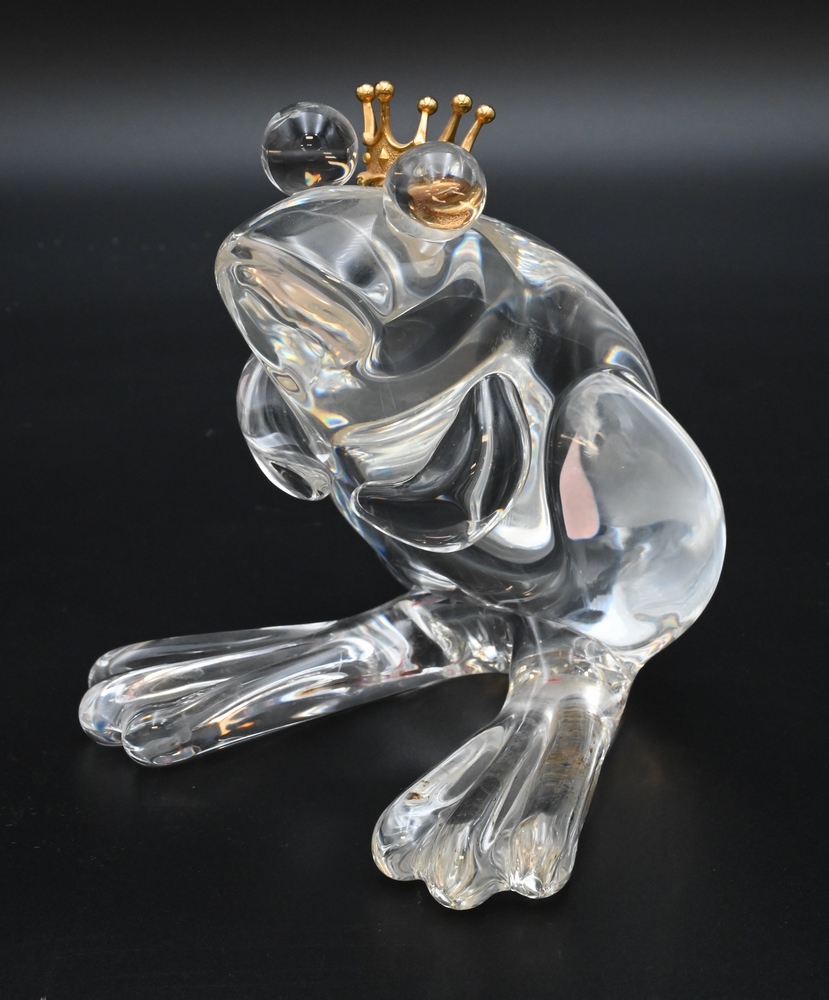 Steuben Glass, Frog Prince figure, having 18 karat gold crown, designed by Lloyd Atkins, 1973, signed Steuben on bottom, height 5 inches. Provenance: Waterfront Estate, Stamford, Connecticut.
