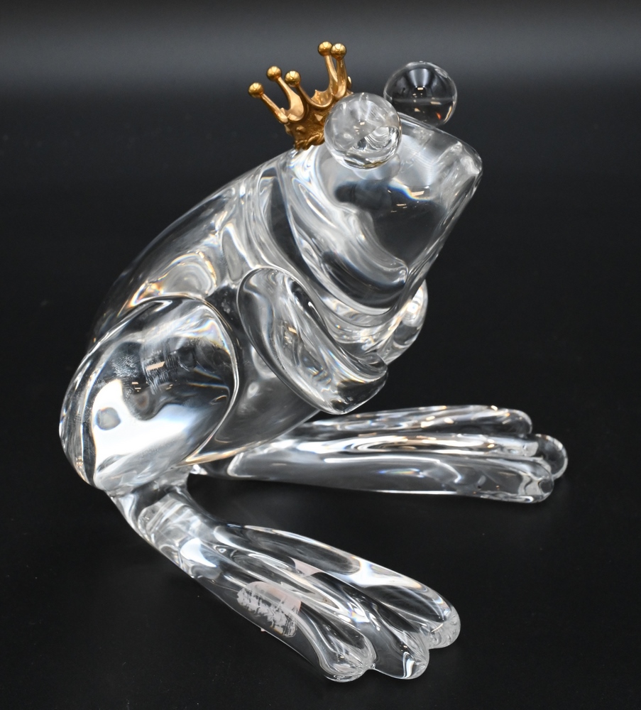 Steuben Glass, Frog Prince figure, having 18 karat gold crown, designed by Lloyd Atkins, 1973, signed Steuben on bottom, in fitted box, height 5 inches.