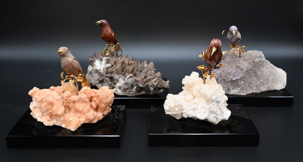 Group of Four Stone and Gold Songbirds, to include jasper bird having gold mounts, sitting on gold branch on white calcite mineral; agate bird having gold mounts, sitting on gold branch mounted on flourite base; obsidian bird having gold mounts, sitting on gold branch mounted on dog’s tooth base; along with agate bird having gold mounts sitting on gold branch, mounted on selenium base; tallest height 6 inches, all listed as totaling 57 grams of gold.