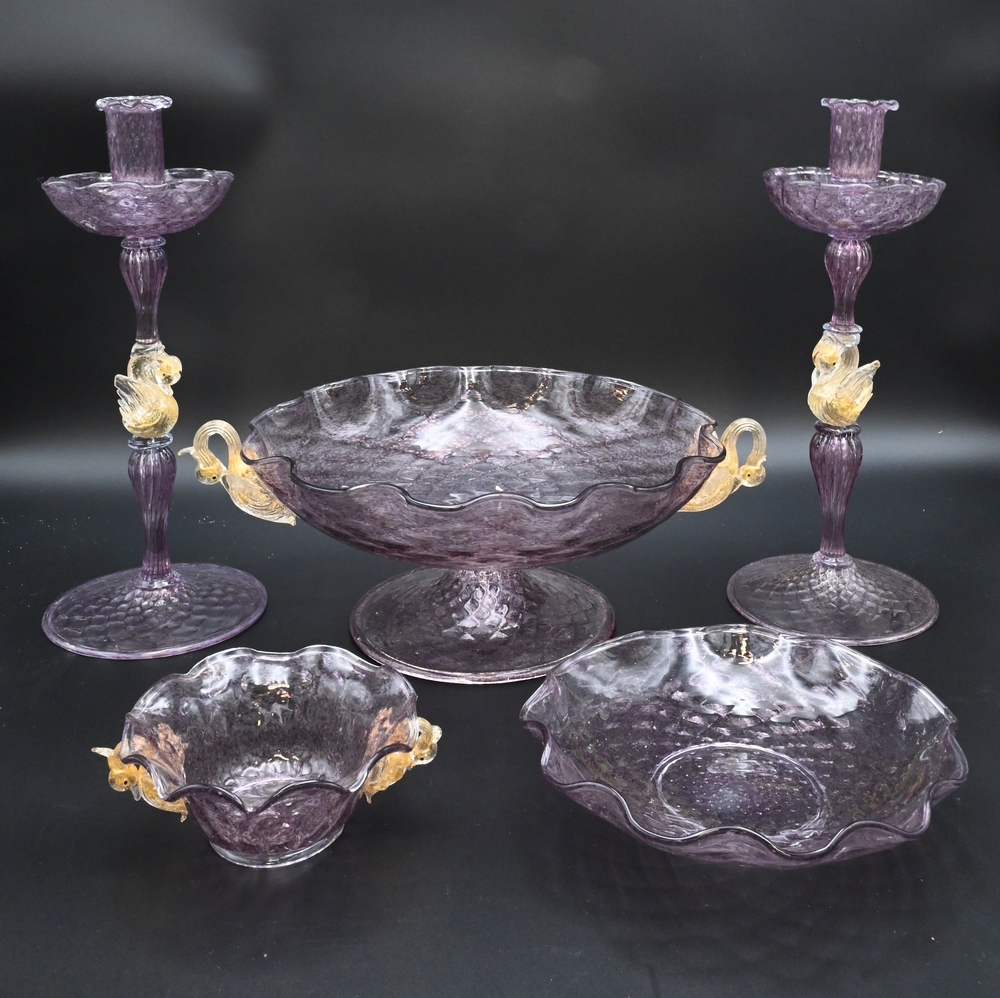 30 Piece Group of Salviati Venetian Glass, amethyst with applied gold swan decoration, to include 3 candlesticks, a large handled compote, 10 bowls, 2 swan bowls, along with 12 plates with ruffle rim; tallest 13 inches. Provenance: Waterfront Estate, Stamford, Connecticut.