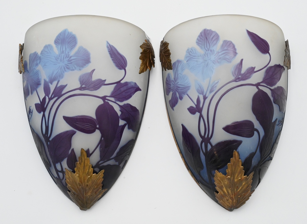 Pair of Galle Cameo Glass Gilt Bronze Mounted Wall Sconces, bullet form frosted glass mottled with cobalt blue and overlaid in purple, cut glass pattern for Clematis blossoms, buds and foliage, each signed in cameo Galle, chip to signature, one leaf support loose, height 9 inches.