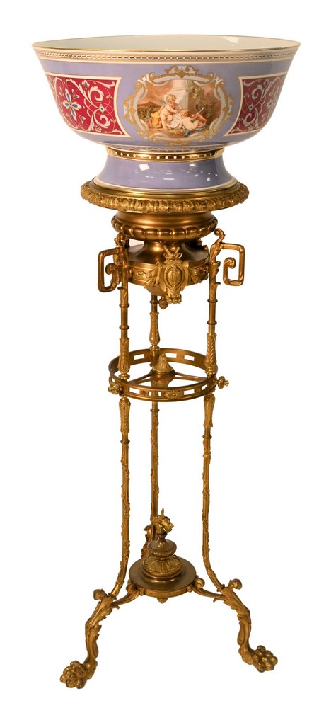 Sevres Porcelain Bowl, having three hand painted panels with putti, on gilt bronze pedestal with large top, leaf carved edge on three legs, center flame, set on large paw feet, pedestal height 46 1/2 inches, height 11 3/4 inches, total height 58 inches, diameter 22 inches.