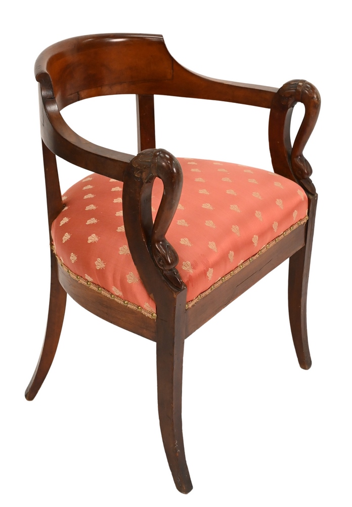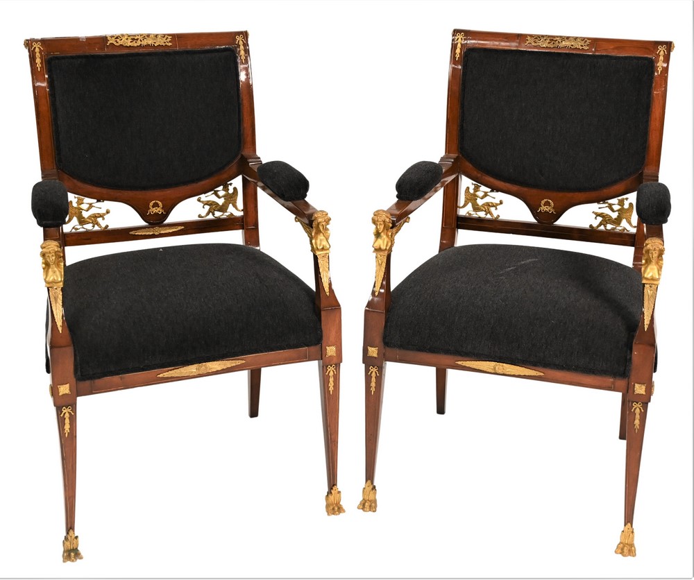 French Empire Style Pair of Mahogany Armchairs, having gilt bronze mounts, mounted with woman hand rests and gilt bronze paw feet, height 38 inches, width 23 inches.