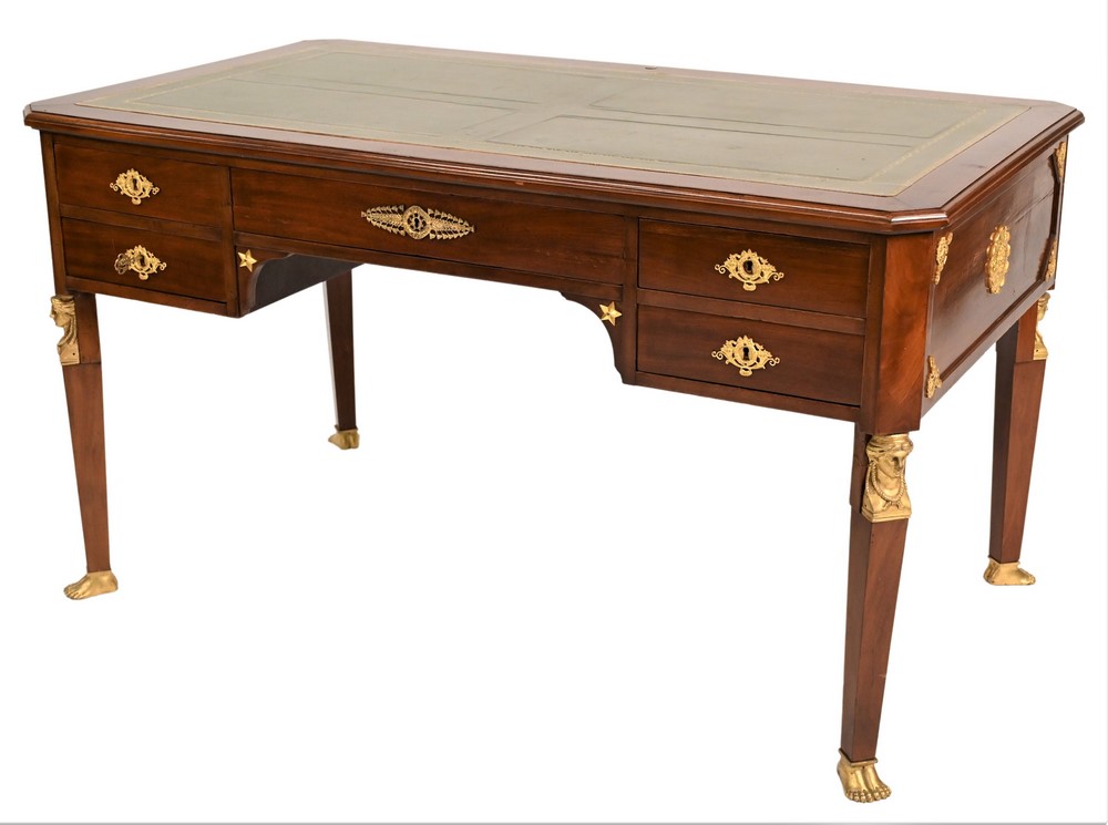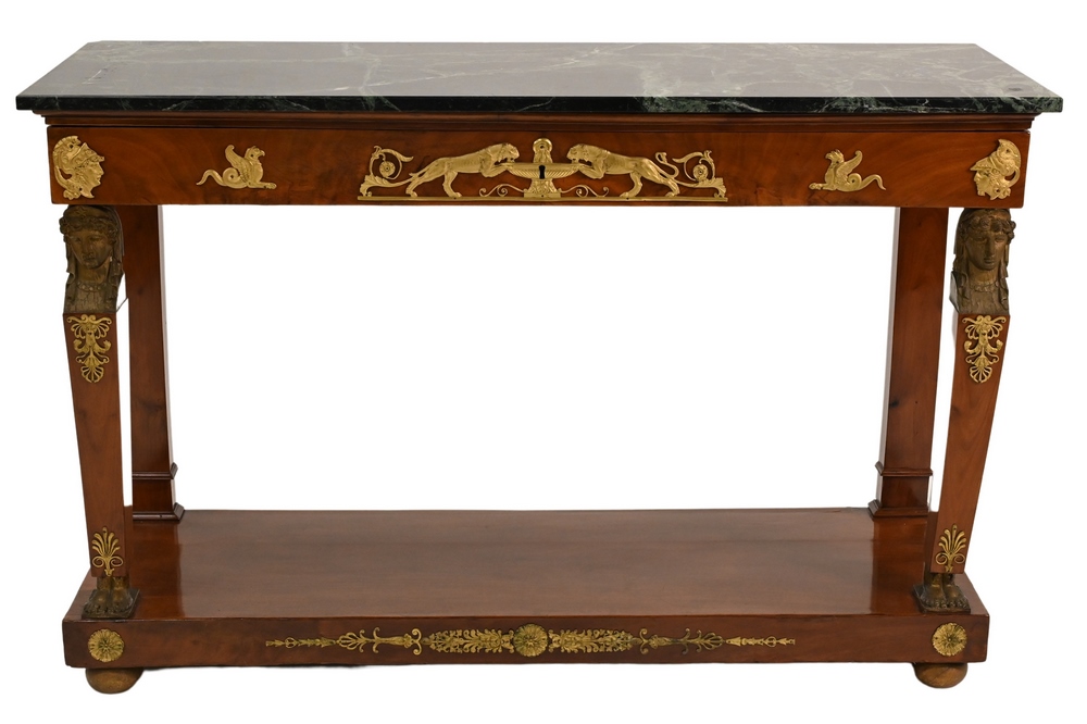French Empire Mahogany Pier Table, having marble top over one drawer with gilt bronze pair of lions drinking, gold painted female heads, double feet, all set on suppressed ball feet, 19th century, height 33 1/2 inches, top 18″ x 51 1/2″. (marble is a replacement). Provenance: Sotheby’s New York, sale 522, lot 109, 10/13/84.