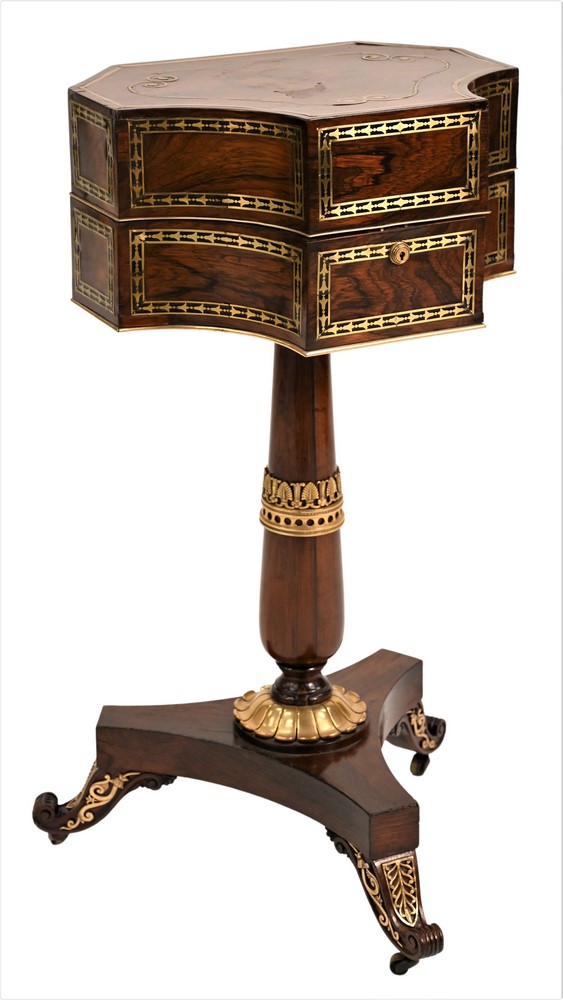 Rosewood and Brass Inlaid Tea Caddy, having hinged shaped lid opening to reveal there crystal covered bowls in silk lined interior, on turned pedestal with gilt bronze mounts on three side base along with three turned up feet in gilt bronze, signed J. Bramah, 124 Piccadilly, height 71 inches, top 12 1/4″ x 16 1/4″.