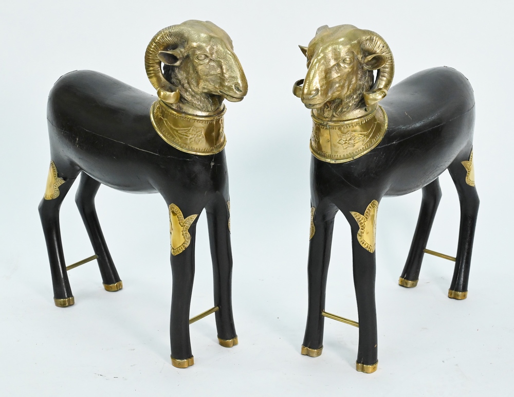 Pair of Large Brass and Wood Ram Figures, having heavy brass rams head mounted on carved wood body, mounted with brass plaques and feet, height 23 inches, length 26 inches.