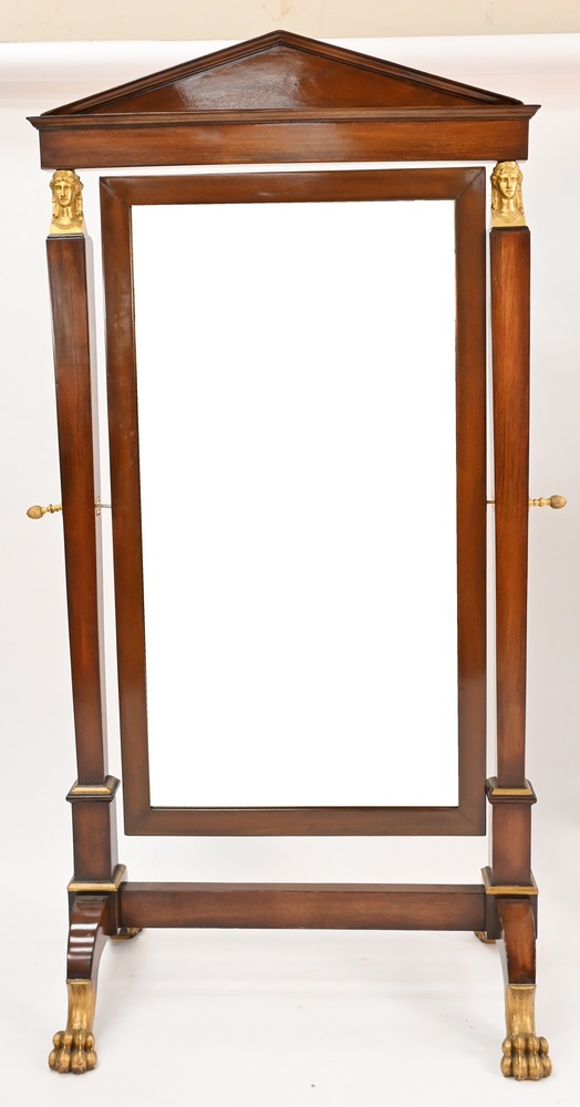 French Empire Style Mahogany Cheval Mirror, having pediment and bronze two-sided female faces, all set on square posts ending in gold painted claw feet, height 81 inches, width 45 inches.