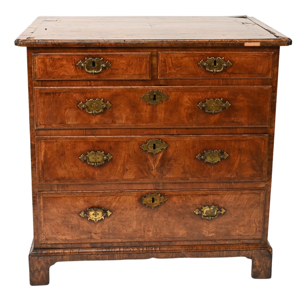 Small Queen Anne Walnut Veneered Chest, having two over three drawers, veneered, banded inlaid walnut, on bracket feet, height 31 inches, width 32 inches, depth 20 1/2 inches, early 18th century. Provenance: From a private New York City collection.