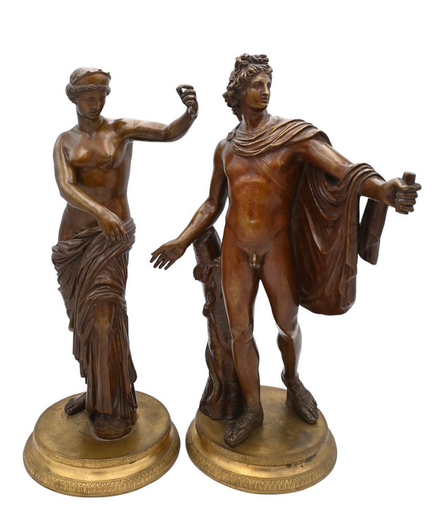Pair of Salvatore Errico Italian Classical Patinated Bronze Figures, modeled as a partially clad woman dancing and a classical archer standing on round gilt bronze base, marked S. Errico, Naples, height 26 inches.