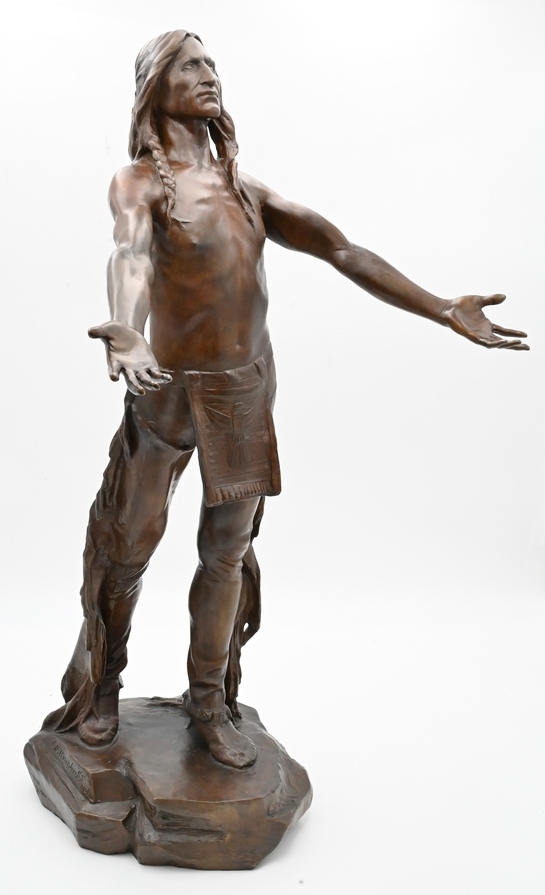 CH Humphriss Bronze Sculpture of an American Indian, having outstretched arms, Appeal to the Great Spirit, having Gorham Company Foundery Mark on base, signed CH Humphriss, 1906, height 31 inches.