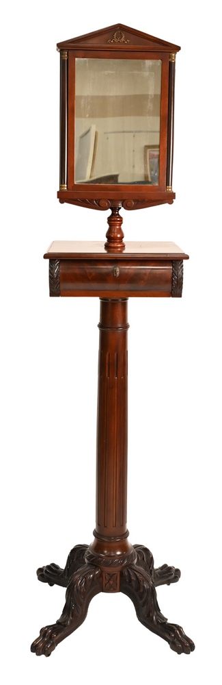 Ernest Hagen Custom Mahogany Shaving Mirror, having opening mirror to reveal three surround mirrors revolving to magnified mirror over one drawer, on fluted shaft set on carved claw feet, top adjusts with separate shaft, signed, height 72 – 74 1/2 inches, with paper label under drawer: Ernest Hagen Furniture Antiques, New York. Provenance: Sold to Dr. W.B. James, Cold Harbor, Long Island, May 1900.