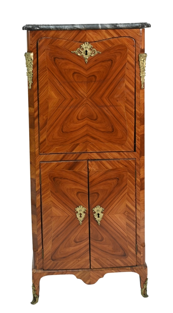Continental Abattant Secretaire, having marble top over four short drawers, over drop front desk, over two doors, inlaid with farmscapes, castle and flowers, 19th century, height 64 inches, top 17 1/2″ x 40 1/2″, (restored).