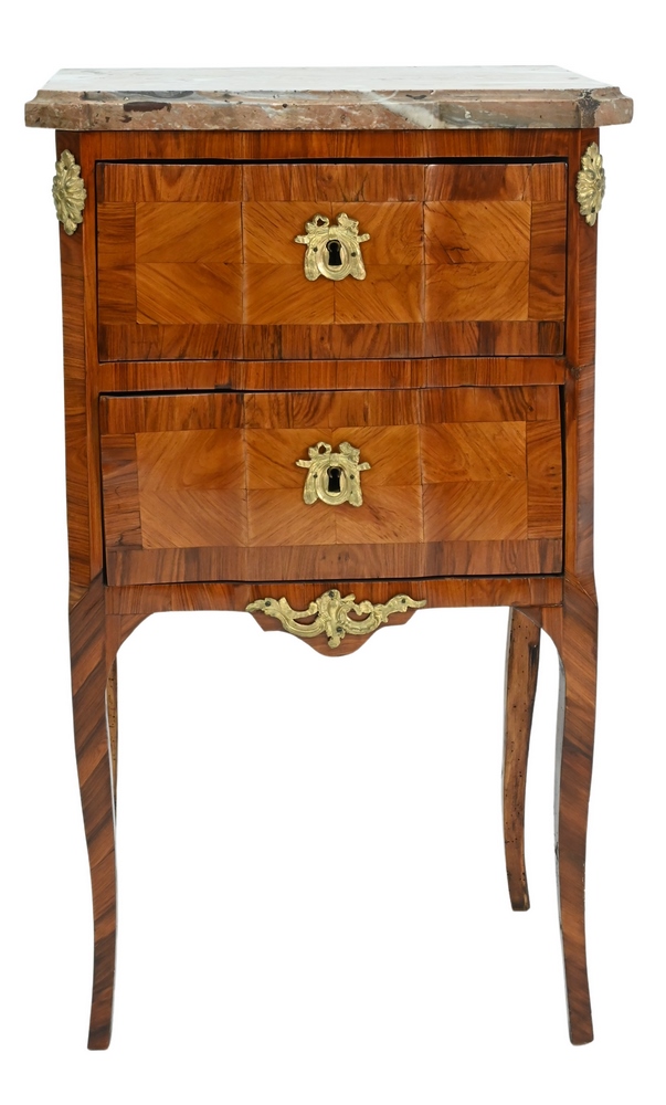Louis XV Small Kingwood and Tulipwood Commode, having pink marble top over two drawers, along with gilt bronze mounts, height 33 inches, width 19 inches, depth 13 inches. Provenance: Property from the Estate of Alexis Gregory, Sold to Benefit the Alexis Gregory Foundation.