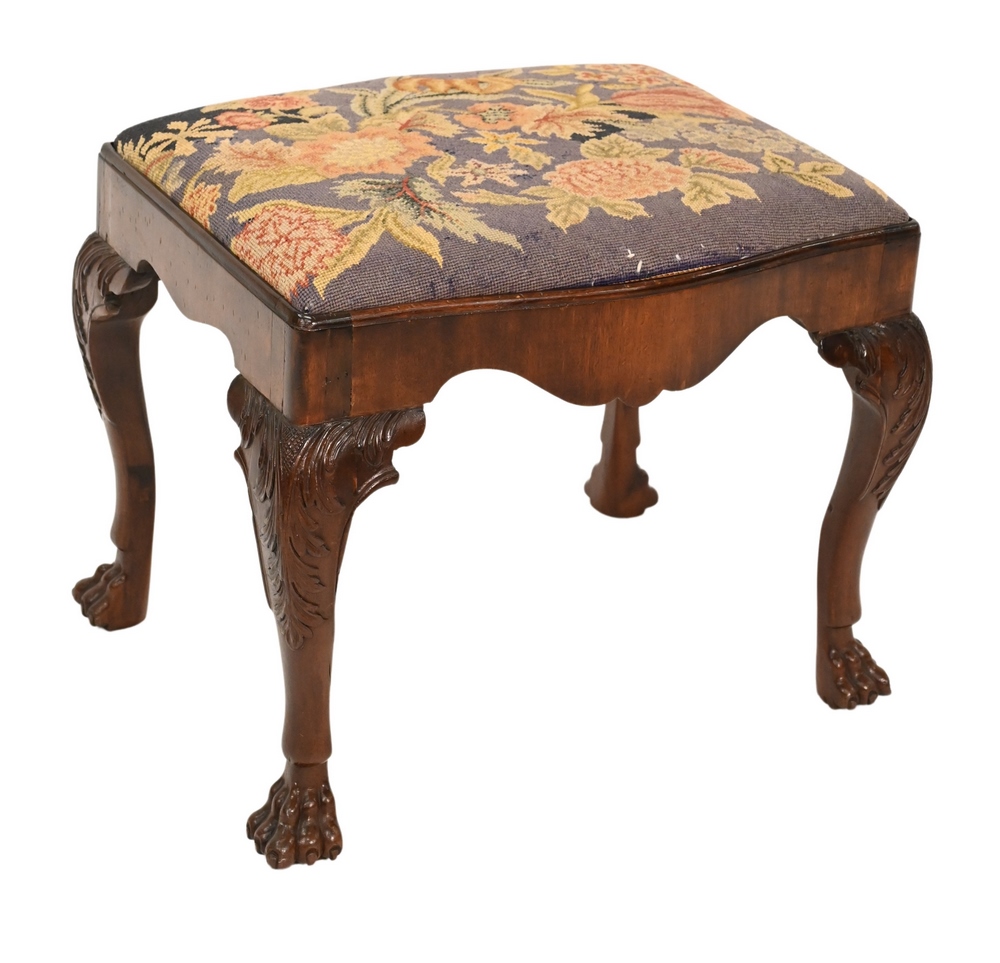 Wooden Bench, having needlepoint embroidered top set on carved legs ending in paw feets, circa 1760, height 18 inches, top 17″ x 20″. Provenance: George Subkoff Antiques, paid $4,500, From a private New York City collection.