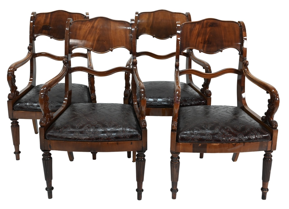 George IV Set of Four Mahogany Armchairs, having shaped molded backs over leather upholstered slip seats, carved arm supports, all set on turned and fluted legs, circa 1830, high gloss finish, seat height 17 inches, height 39 inches, width 23 inches.