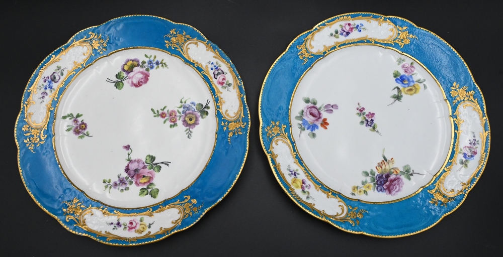 Set of 10 Sevres Porcelain Plates, 18th century, having blue with heavy gold decorated rim, painted flowers, diameter 9 1/2 inches. Provenance: Property from the Estate of Alexis Gregory, Sold to Benefit the Alexis Gregory Foundation.