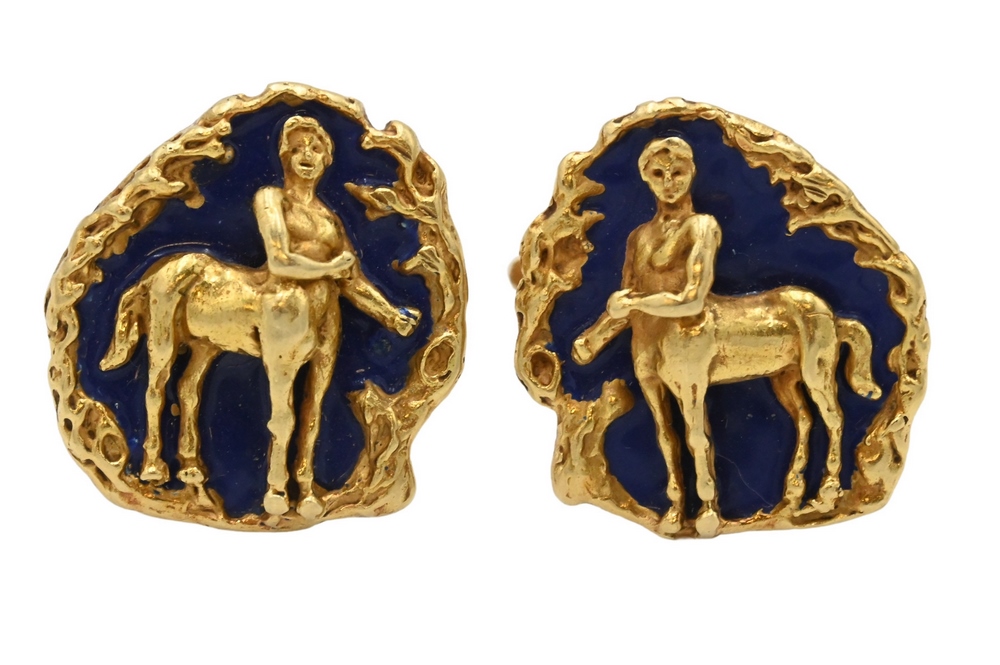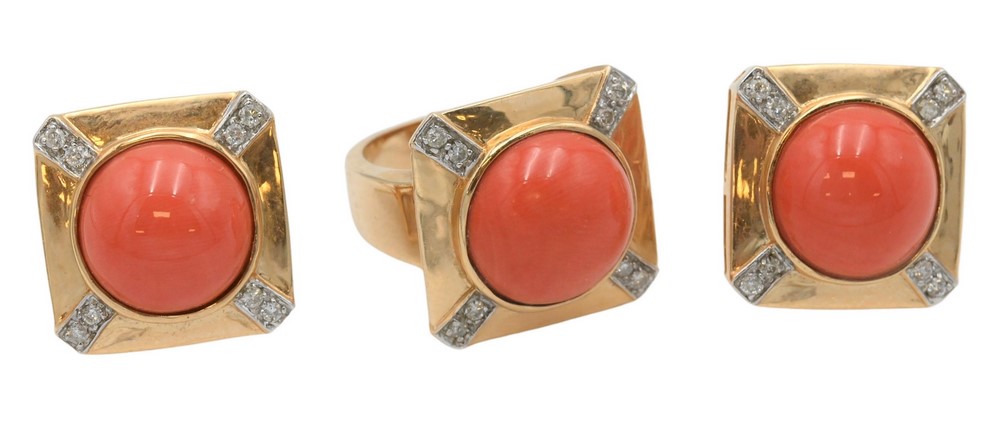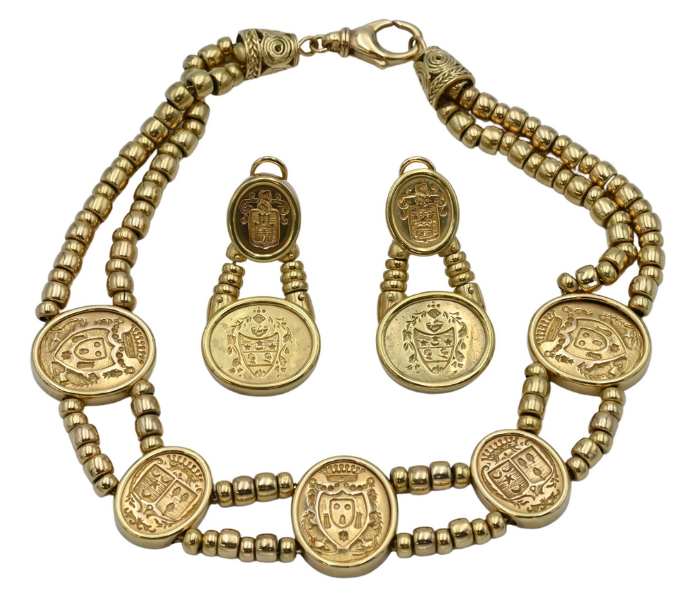 18 Karat Gold Three Piece Set, to include ear clips and necklace, all mounted with oval medallions in the form of coat of arms and gold beads, ear clips 1 3/4 inches, necklace 14 inches, 151.5 grams.