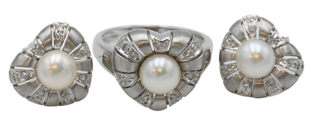 18 Karat White Gold Three Piece Set, to include a ring, size 6 1/2; along with a pair of pierced earrings, each set with center pearl and small diamonds, 11 grams.