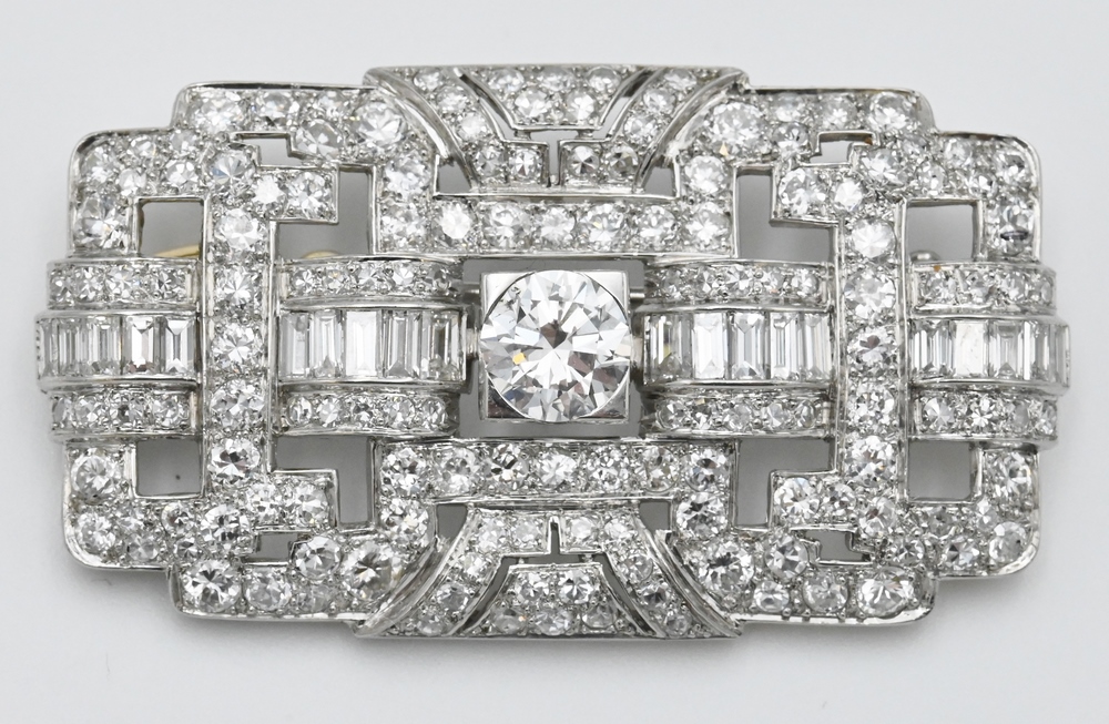 Platinum Diamond Brooch, rectangular shape, measuring approximately 2 x 1 1/8 inches, pave set with 154 round full and single cut diamonds, diamonds have an approximate total carat weight of 6.0 carats by formula averaging H-I color and S12 -I1 clarity; the center diamond is round brilliant cut with H-I color and S12 – I1 clarity with an approximate carat weight of 1.40 by formula, measuring approximately 7.25 x 7.29 x 4.35 millimeters; the center diamond is flanked by 20 straight baguette cut diamonds averaging H-I color and VS clarity, with an approximate carat weight of 1.20 by formula; the pin with diamonds weighs approximately 11.40 dwt.; 175 diamond total, 8.6 total carats in diamonds.