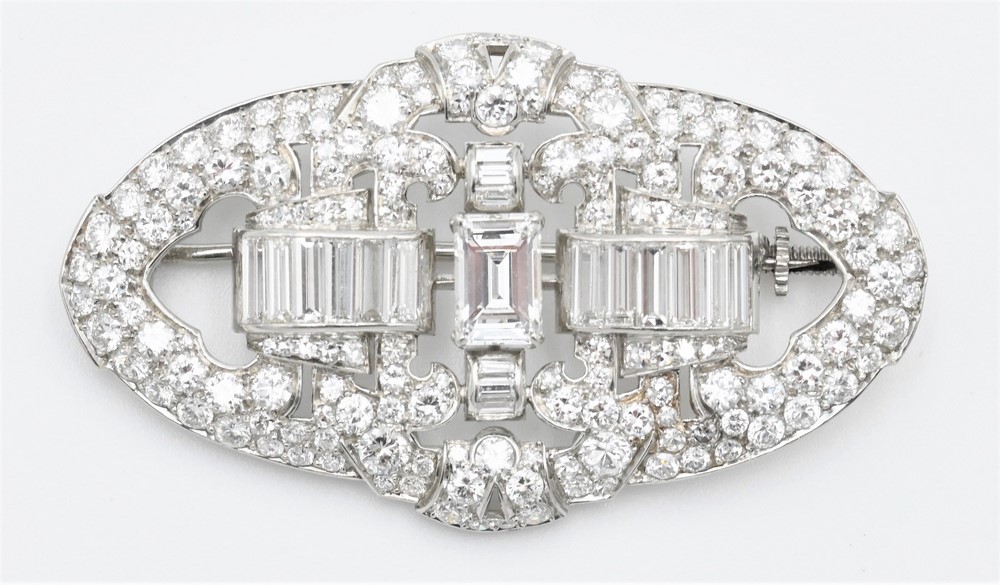 Platinum Diamond Brooch, oval shape measuring approximately 2 x 1 1/4 inches; pave set with 158 round full and single cut diamonds, approximate total carat weight is 5.75 by formula; the diamonds average H-I color and SI clarity, the center is set with 1 emerald cut diamond measuring approximately 7.77 x 5.52 x 3.49 millimeters with an approximate carat weight of 1.28 by formula, the diamond has H color VS clarity. each side of center is set with 6 straight baguette cut diamonds and another 3 baguette cut diamonds on each end of center, the diamonds average H color and VS clarity with an approximate total carat weight of 2.60 by formula, the pin with diamonds weighs approximately 9.05 dwt., the pin stem tests platinum; total carat weight 9.63 carats, 177 total diamonds.