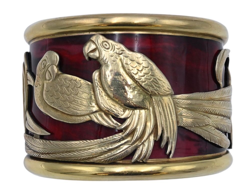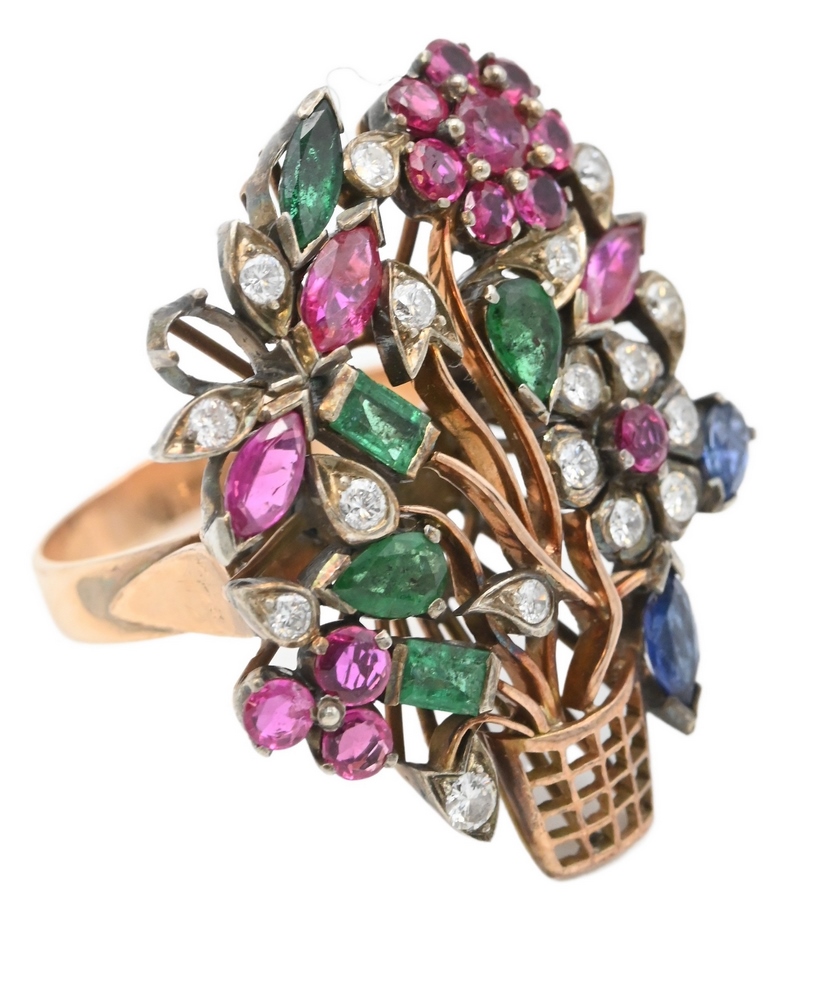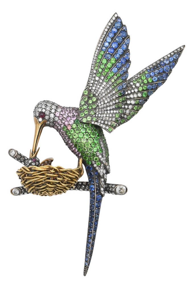 18 Karat Gold and Sterling Silver Hummingbird Brooch, on a nest with a branch, completely encrusted with diamonds, blue sapphires, emeralds, pink sapphires, having ruby eye, feeding a baby bird of diamonds and pink sapphires with ruby eye, in woven gold nest