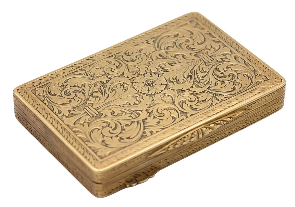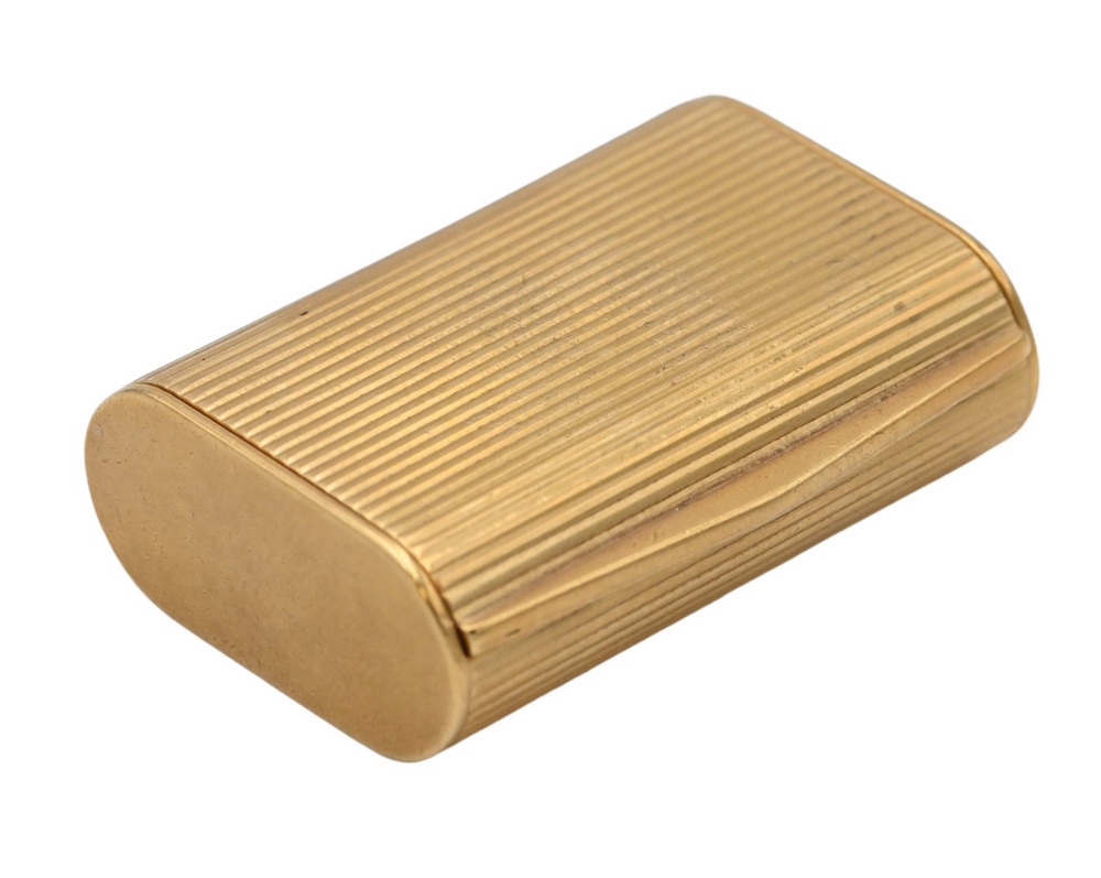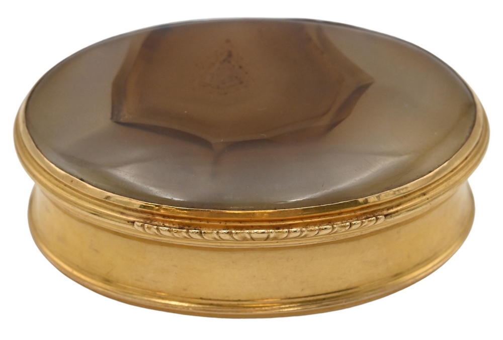20 – 22 Karat Gold and Agate Oval Box, probably Dutch, 1 5/8 x 2 x 3/4 inches, 76 grams total weight. Provenance: Collection of Anton Peek previously from the Hague.